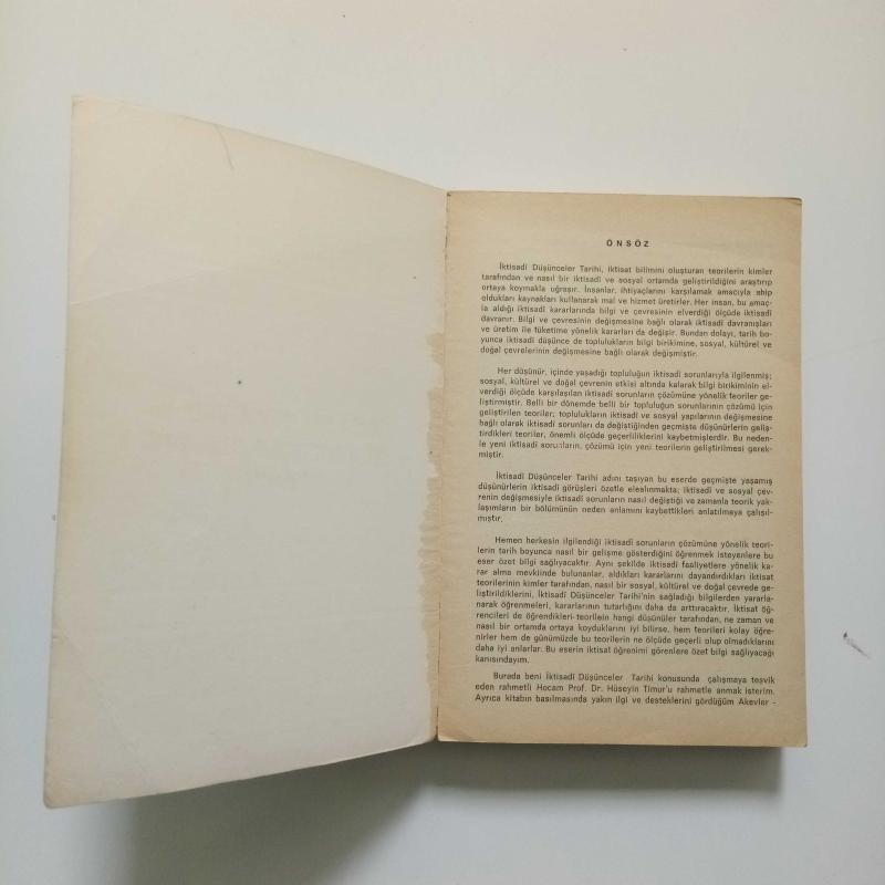 İktisadî Düşünceler Tarihi adını taşıyan bu eserde geçmişte yaşamış düşünürlerin İktisadî görüşleri özetle ele alınmakta; İktisadî ve sosyal çevrenin değişmesiyle İktisadî sorunların nasıl değiştiği ve zamanla teorik yaklaşımların bir bölümünün neden anlamını kaybettikleri anlatılmaya çalışılmıştır. Hemen herkesin ilgilendiği İktisadî sorunların çözümüne yönelik teorilerin tarih boyunca nasıl bir gelişme gösterdiğini öğrenmek isteyenlere bu eser özet bilgi sağlıyacaktır. Aynı şekilde İktisadî faaliyetlere yönelik karar alma mevkiinde bulunanlar, aldıkları kararlarını dayandırdıkları iktisat teorilerinin kimler tarafından, nasıl bir sosyal, kültürel ve doğal çevrede geliştirildiklerini, İktisadî Düşünceler Tarihi'nin sağladığı bilgilerden yararlanarak öğrenmeleri, kararlarının tutarlığını daha da arttıracaktır. İktisat öğrencileri de öğrendikleri-teorilein hangi düşünüler tarafından, ne zaman ve nasıl bir ortamda ortaya koyduklarını iyi bilirse, hem teorileri kolay öğrenirler hem de günümüzde bu teorilerin ne ölçüde geçerli olup olmadıklarını daha iyi anlarlar. Bu eserin iktisat öğrenimi görenlere özet bilgi sağlıyacağı kanısındayım.