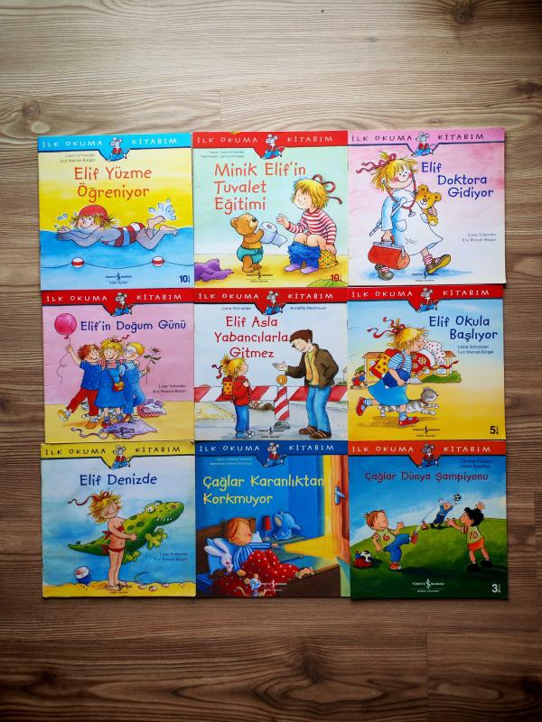 İLK OKUMA KİTABIM SERİSİ - İLK OKUMA KİTABIM ELİF YÜZME ÖĞRENİYOR-İLK OKUMA KİTABIM ELİF DOKTORA GİDİYOR-İLK OKUMA KİTABIM ELİF'İN DOĞUM GÜNÜ-İLK OKUMA KİTABIM ELİF OKULA BAŞLIYOR-İLK OKUMA KİTABIM ELİF ASLA YABANCILARLA GİTMEZ-İLK OKUMA KİTABIM MİNİK ELİF'İN TUVALET EĞİTİMİ-İLK OKUMA KİTABIM ELİF DENİZDE-İLK OKUMA KİTABIM ÇAĞLAR DÜNYA ŞAMPİYONU-İLK OKUMA KİTABIM ÇAĞLAR KARANLIKTAN KORKMUYOR ( 9 KİTAP ), LİANE SCHNEİDER - EVA WENZEL-BÜRGER tarafından kaleme alınmıştır. Eser NEVİN AVAN ÖZDEMİR editörlüğünde hazırlanmıştır. Kitap 2022 yılında İŞ BANKASI KÜLTÜR YAYINLARI tarafından [İSTANBUL] 9786052953136 ISBN kodu ile yayınlanmıştır. Satışta olan kitap, yayınevinin 10. baskısıdır. Bu baskının çevirisi AYLİN GERGİN tarafından yapılmıştır. İLK OKUMA KİTABIM SERİSİ - İLK OKUMA KİTABIM ELİF YÜZME ÖĞRENİYOR-İLK OKUMA KİTABIM ELİF DOKTORA GİDİYOR-İLK OKUMA KİTABIM ELİF'İN DOĞUM GÜNÜ-İLK OKUMA KİTABIM ELİF OKULA BAŞLIYOR-İLK OKUMA KİTABIM ELİF ASLA YABANCILARLA GİTMEZ-İLK OKUMA KİTABIM MİNİK ELİF'İN TUVALET EĞİTİMİ-İLK OKUMA KİTABIM ELİF DENİZDE-İLK OKUMA KİTABIM ÇAĞLAR DÜNYA ŞAMPİYONU-İLK OKUMA KİTABIM ÇAĞLAR KARANLIKTAN KORKMUYOR ( 9 KİTAP ) adlı eser Türkçe dilindedir.