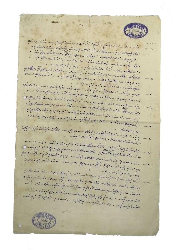 Orijinal, tamamı Osmanlıca mavi mürekkeple yazılmış, mühürlü sözleşme. Kenarlarında hafif yıpranma, bir çift delgeç deliği ve kağıtta lekeler mevcut. Haricen iyi durumda. 34,5x23 cm. [ŞEKER FABRİKALARI - OSMANLI / CUMHURİYET DÖNEMİ İKTİSADI / SANAYİİ] Uşak Terakki-i Ziraat Türk Anonim Şirketi’nin inşaatını bitirmiş olduğu şeker fabrikası için gerekli olan pancarın temini için üreticilerle yapılan sözleşme şartları. Mühürlü (Terakki Ziraat Türk Anonim Şirketi). Uşak Şeker Fabrikası. Uşak eşrafından Mehmet Hacım ve arkadaşları tarafından bir anonim şirket olarak kurulan şeker fabrikasıdır. Türkiye'nin ilk şeker fabrikası olarak bilinir. Cumhuriyet'in kurulması ve gelişmesi döneminde önemli bir kilometre taşıdır. Bütün Uşak halkı kurulmasına katkıda bulunmuştur. Ekonomik gücü olan her Uşaklı bu girişime katkıda bulunmuştur. Fabrika, etkinliğini günümüzde de sürdürmektedir. Fabrikanın adı bir süre sonra "Nuri Şeker" olarak değiştirilmiştir. Kuruluş çalışmalarının izlenmesi amacıyla Ankara'ya gönderilen Şeker, sonraları fabrikanın kurucusu olarak anılmaya başlamıştır. Tüm Uşaklıların katkılarıyla kurulmuş olan ve Türk Kurtuluş Savaşı sonrası dayanışmanın bir ürünü olarak ortaya çıkan fabrikanın en büyük ortağı Mehmet Hacım'dır. CHP döneminde devletleştirilen fabrika Uşak'ın en önemli kurumlarından biri olma özelliğini korumaktadır.
