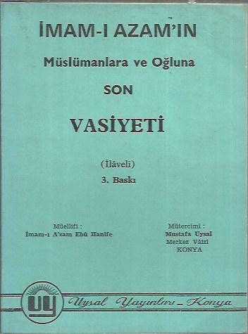 İMAM-I AZAM'IN MÜSLÜMANLARA VE OĞLUNA SON VASİYETİ, İMAM-I AZAM EBU HANİFE tarafından kaleme alınmıştır. Kitap 1974 yılında UYSAL YAYINLARI tarafından [Konya] yayınlanmıştır. Bu baskının çevirisi MUSTAFA UYSAL tarafından yapılmıştır. 68 sayfadır. İMAM-I AZAM'IN MÜSLÜMANLARA VE OĞLUNA SON VASİYETİ adlı eser Türkçe dilindedir.