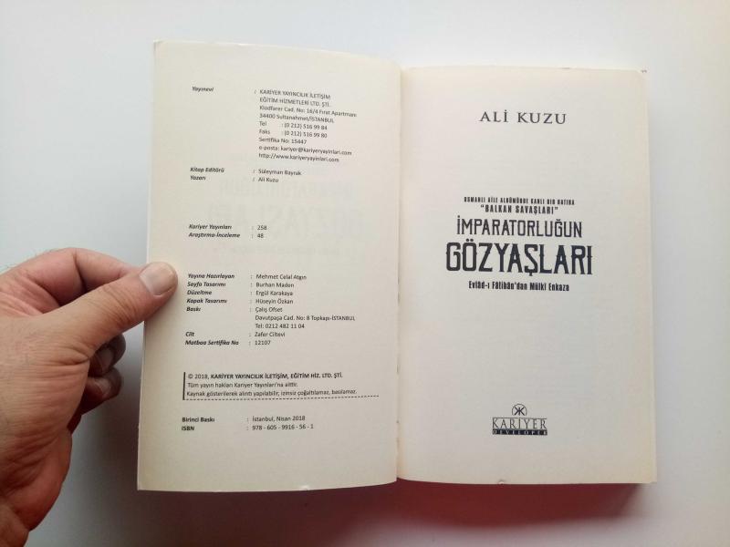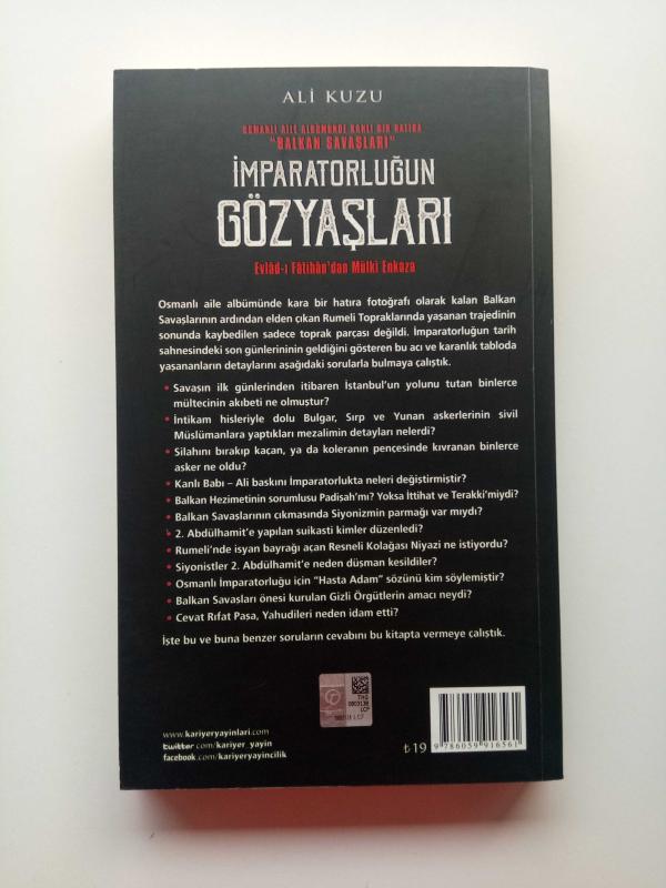 İMPARATORLUĞUN GÖZYAŞLARI (OSMANLI AİLE ALBÜMÜNDE KANLI BİR HATIRA BALKAN SAVAŞLARI) (EVLAD-I FATİHAN'DAN MÜLKİ ENKAZA) (2. EL), ALİ KUZU tarafından kaleme alınmıştır. Eser SÜLEYMAN BAYRAK, MEHMET CELAL ATGIN editörlüğünde hazırlanmıştır. Kitap 2018 yılında KARİYER YAYINLARI tarafından [İSTANBUL] 978-605-9916-56-1 ISBN kodu ile yayınlanmıştır. Satışta olan kitap, yayınevinin 1. baskısıdır. 240 sayfadır. Sayfa bilgisi 2. HAMUR olarak belirtilmiştir. İMPARATORLUĞUN GÖZYAŞLARI (OSMANLI AİLE ALBÜMÜNDE KANLI BİR HATIRA BALKAN SAVAŞLARI) (EVLAD-I FATİHAN'DAN MÜLKİ ENKAZA) (2. EL) adlı eser Türkçe dilindedir.