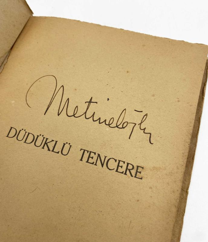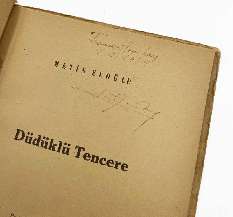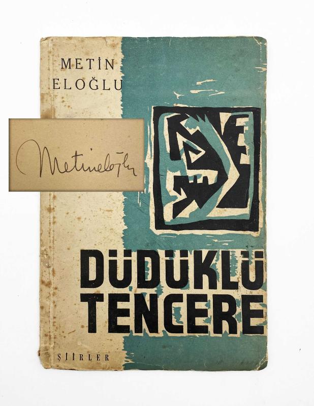 METİN ELOĞLU (1927-1985), Yeditepe Yayınevi, İstanbul Matbaası, İstanbul, 1951. Özgün karton kapağında, temiz durumda, 21,5 x 15 cm, 47 sayfa, s/b resimli. Şair - ressamın ilk şiir kitabının imzalı ilk baskısı. Kitabın kapak ve içteki soyut desenler ve resimler ressam Orhan Peker'e aittir. Eloğlu 'nun bu ilk kitabının içinde toplam 28 adet şiir mevcuttur. Şairden ithafsız bir biçimde kolofon sayfasında imzalıdır. Bu kitap, Orhan Veli'nin "Şoförün Karısı", "Dedikodu" (bkz. Garip) ve Tahattur, Altın Dişlim, vb. (Yenisi) gibi, lumpen ortatabakanın dilini ve duyarlılığını yansıtan şiirlerinden esinlenmiş bir şairin ürünlerini içeriyor. Fakat yine bu kitabında Nâzım Hikmet'in "İnsan Manzaraları"nı bilen bir şair de seziliyor. Eloğlu ilk kitabıyla, lumpen çevrelerin, kenar mahalle insanının dilini, sözcüklerini, duyarlılığını, çok başarılı bir konuşma dili, edası ve özgün bir ironiyle yansıtmayı başarıyor. Orhan Veli'de dilsel alanda kalan bir tutumu geniş bir alana çıkararak şiirimize yeni bir ufuk kazandırıyor. (Vikipedi).