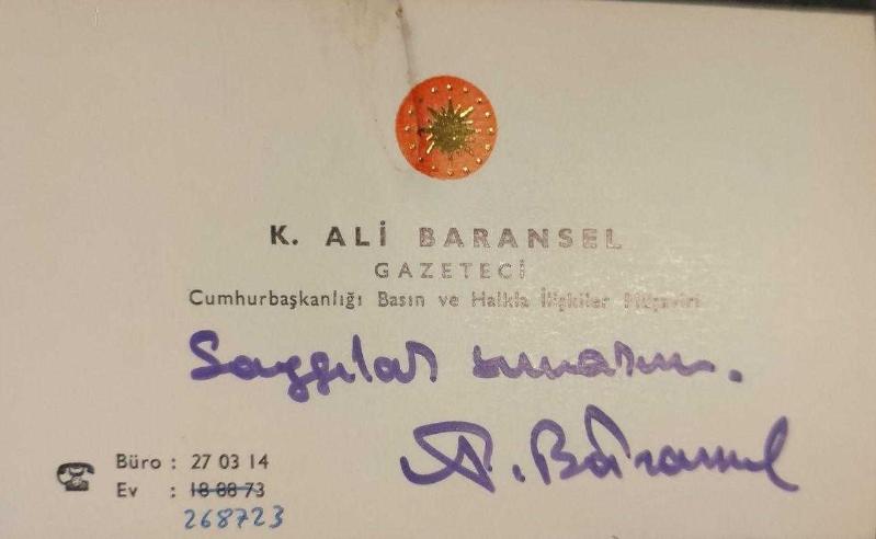 İMZALI KARTVİZİT GAZETECİ K. ALİ BARANSEL CUMHURBAŞKANLIĞI BASIN VE HALKLA İLİŞKİLER MÜŞAVİRİ, en son 3 ay önce güncellenmiştir.