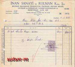 ** İNAN SANAYİ VE RULMAN KOLL.ŞTİ. ** Yaklaşık yarım A4 ebadında,1 Mayıs 1973 tarihli, Hisar İplik Fabrikası adına kesilmiş, bir adet damga pullu ve gayet iyi kondüsyonda olan, kösele kayışı konulu eski orijinal faturadır...