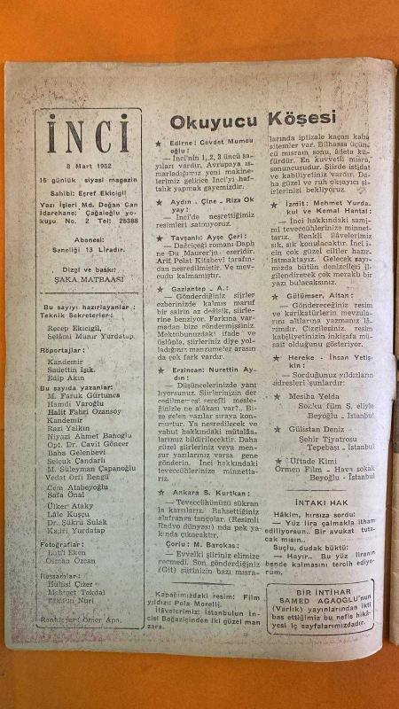 İNCİ SİYASİ MAGAZİN DERGİSİ - 8 MART 1952 SAYI: 8 — NEVİN AYPAR - POLA MORELLI - SAMED AĞAOĞLU - ZEKİ MÜREN - YÖRÜK ALİ EFE - KANDEMİR - RAZİ YALKIN - HALİT FAHRİ OZANSOY - CEM ATABEYOĞLU - SELÇUK ÇANDARLI - SAFÂ ÖNAL - NİYAZİ AHMET BANOĞLU - BAHA GELENBEVİ - VEDAT ÖRFI BENGÜ - M. FARUK GÜRTUNCA - HAMDİ VAROĞLU - DR. CAVİT GÖNCER - ÜLKER ATAKY - LÂLE KUŞÇU - DR. ŞÜKRÜ SULAK - KADRİ YURDATAP - HULUSİ ÇİZER - MEHMET TEKDAL - EFLATUN NURİ - ÖMER APA - BU SAYIDA RENKLİ TABLO İLAVESİ - OKUYUCU KÖŞESİNDEN MEKTUPLAR - POLA MORELLI KAPAK YILDIZI - BİR İNTİHAR - SAMED AĞAOĞLU’NDAN AŞK VE HİS HİKÂYESİ - TELEFON SANTRALİNDEN HASRET KAVUŞTURAN TEKNOLOJİ - KANDEMİR’DEN ŞEHİRLERARASI TELEFON İZLENİMLERİ - MİLLÎ MÜCADELEDEN MENKIBELER - YÖRÜK ALİ EFE’NİN DESTANSI MÜCADELESİ - EGE EFELERİ VE İLK KURŞUNUN HATIRASI - RUMLARIN İŞGAL HAZIRLIKLARI - ÇİNE CEPHESİNİN KURULUŞU - MİLLÎ ŞEREFİ KORUMA AZMİ - KADININ İÇ DÜNYASINDAKİ ÇATIŞMA - AŞK VE İHTİRAS ARASINDAKİ GERİLİM - ZEKİ MÜREN’İ - TAM TAKIM - 48 SAYFA adlı eser, Kitap > Süreli Yayınlar > Dergiler > Sanat > Sinema, Radyo, TV kategorisinde İkinci El olarak satıştadır.