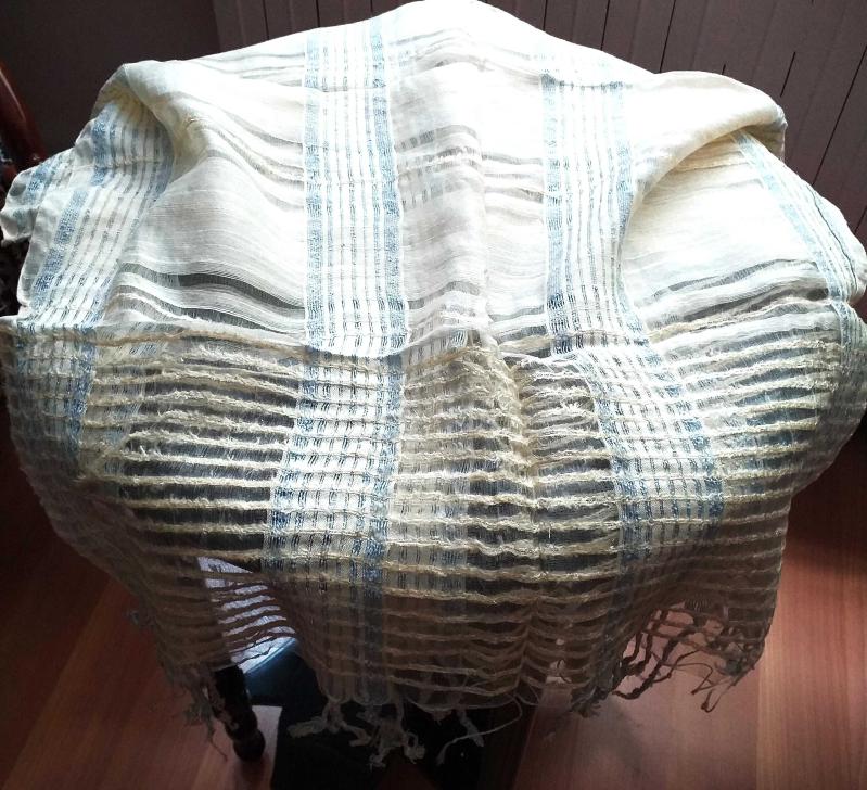 İPEK BÜRÜMCÜK ŞAL MAVİ BEYAZ başlıklı antika/koleksiyon objesi Türkiye menşe’lidir. 1950-1999 arası dönemine aittir.