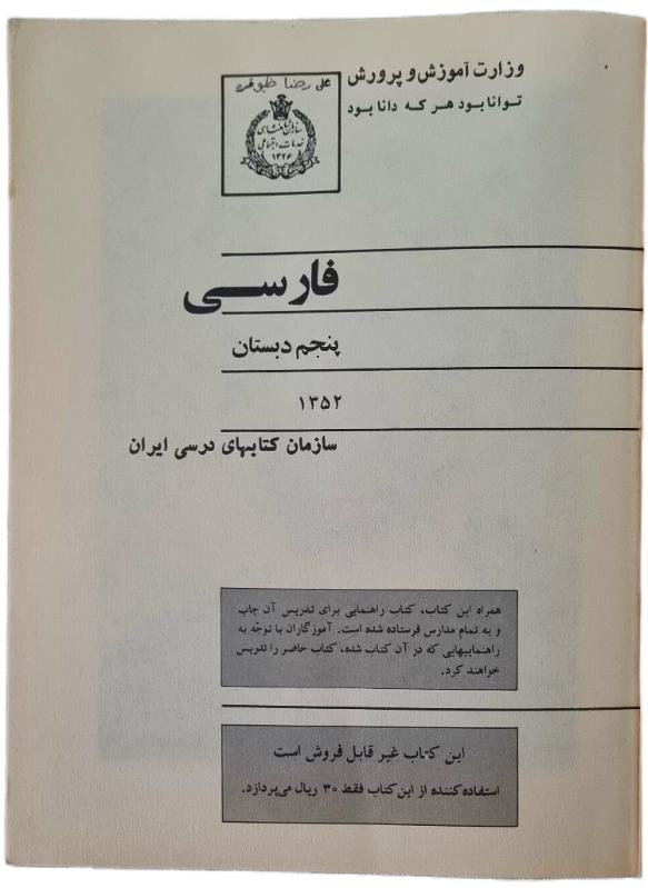 Kitap 1352 yılında İRAN MİLLİ EĞİTİM BAKANLIĞI tarafından [Tahran] yayınlanmıştır. 233 sayfadır. İRAN 5.SINIF FARSÇA DERS KİTABI 1973/1352 ORİJİNAL DEVLET BASKISI (İran, Rıza Pehlevi dönemi ders kitabı - Pehlevi ve ailesi portreli) adlı eser Farsça dilindedir.