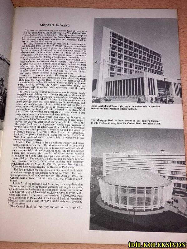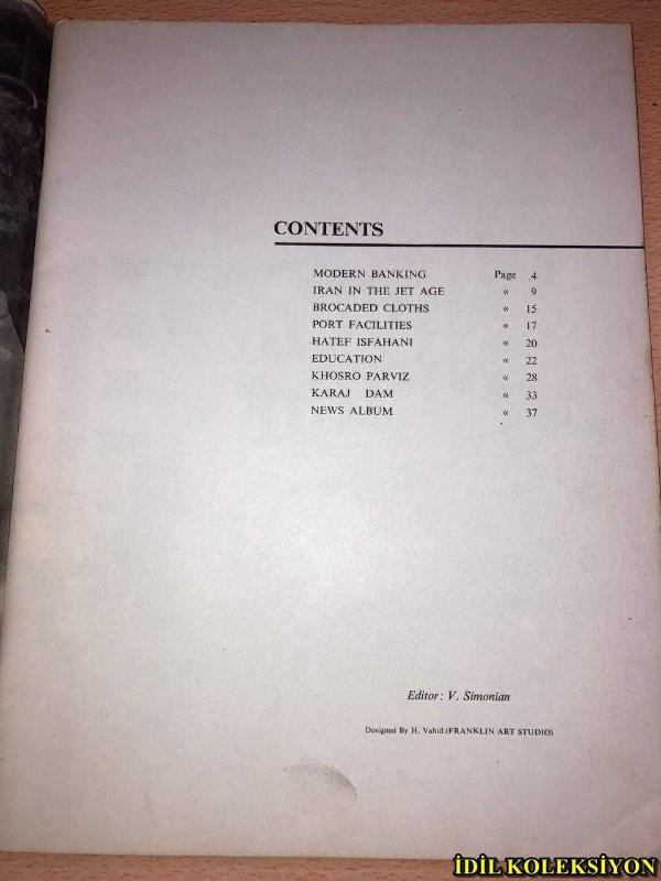 Eser V. SİMONİAN editörlüğünde hazırlanmıştır. Kitap İRAN İMPARATORLUK HÜKÜMETİ YAYIN VE RADYO DAİRESİ tarafından [IRAN] yayınlanmıştır. 48 sayfadır. IRAN TODAY - VOLUME 2. (5) SERİE NO 12 - PUBLİSHED BY THE GENERAL DEPARTMENT OF PUBLİCATİON AND BROADCASTİNG OF THE IMPERİAL IRANIAN GOVERNMENT (MODERN BANKİNG / IRAN IN THE JET AGE / BROCADED CLOTHS / PORT FACİLİTİES / HATEF ISFAHANİ / EDUCATİON / KHOSRO PARVİZ / KARAJ DAM / NEWS ALBUM) - İNGİLİZCE adlı eser İngilizce dilindedir.