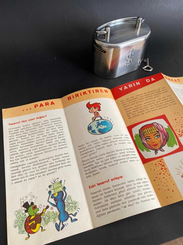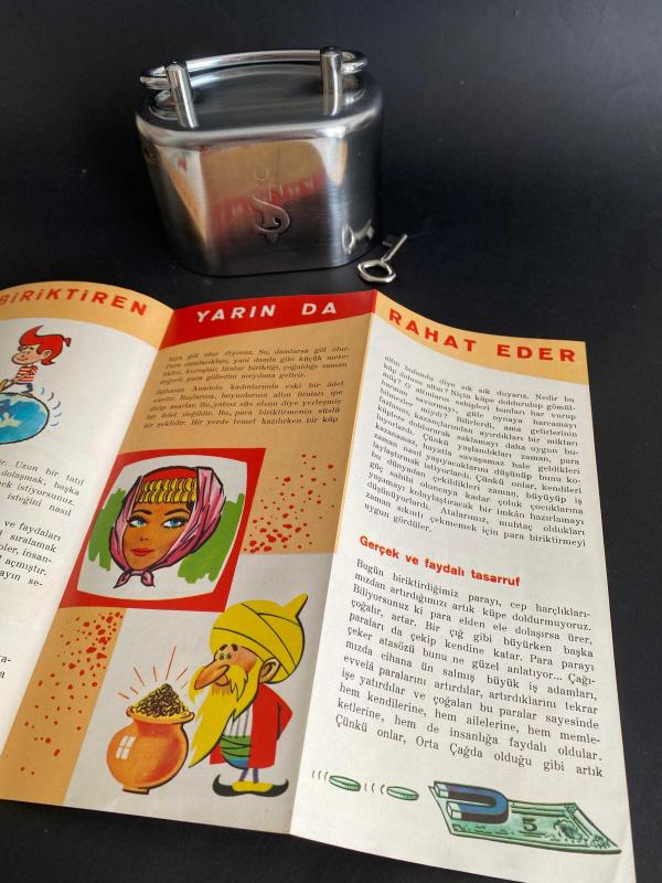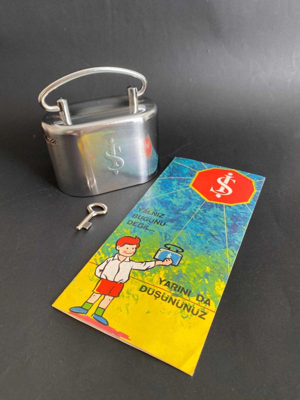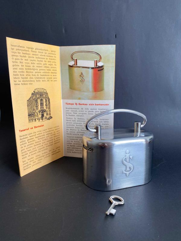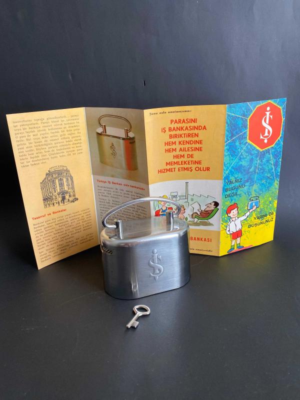 İŞ BANKASI KUMBARA ANAHTARLI VE TANITIM BROŞÜRÜ NADİR KOLEKSİYONLUK başlıklı antika/koleksiyon objesi Türkiye menşe’lidir. 1950-1999 arası dönemine aittir.