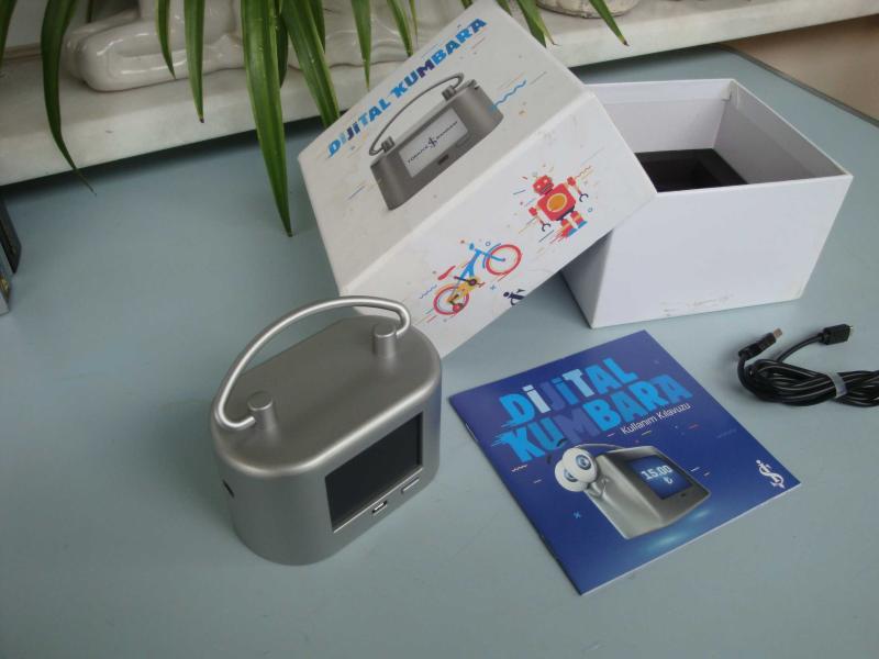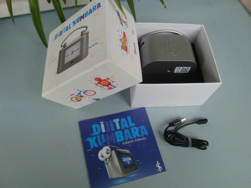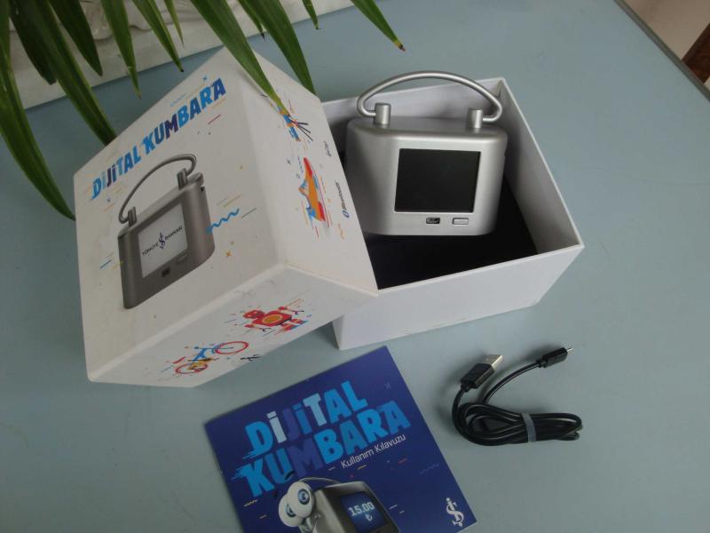 İŞ BANKASI " Sesli & LCD Ekranlı Dijital Kumbara " ( SIFIR / KUTUSUNDA ) Özellik : 18 yaşından küçük çocuklarımıza ait bir Vadesiz TL hesabı ve Vadeli Kumbara Hesabı’na bağlı olarak çalışan Dijital Kumbara’ya Bluetooth özelliği açık olan bir akıllı cep telefonundan İşCep içerisindeki “Dijital Kumbara” menüsü aracılığıyla para gönderilebiliyor. Dijital Kumbara’ya gönderilen tutarlar, çocuğun Vadeli Kumbara Hesabı’nda değerlendiriliyor. İşCep’ten Dijital Kumbara menüsüne giren İş Bankası müşterileri (veli ve 3. kişiler) telefonlarının Bluetooth özelliğini açarak etraflarındaki kumbaraları görüntüleyerek, para göndermek istedikleri kumbara ismini seçip, transfer etmek istedikleri tutarı “kaydır-at” özelliği ya da “işlem tutarı girişi” ile Dijital Kumbara’ya gönderebiliyor. Üstelik Dijital Kumbara’nın ekranında görüntülenmesini istedikleri mesajları ile birlikte! Bunun için yalnızca İşCep kullanıcısı olmak ve etraftaki Dijital Kumbaralar arasından gönderim yapmak istenen çocuğun ad ve soyad bilgilerinin bilinmesi yeterli. Genel Not: Gri renkli Türkiye İş Bankası dijital sesli kumbarasıdır. Ekranda hem içindeki para miktarı görünmekte olup, hem de blutetooth kablosu sayesinde bankadaki mevduat hesabında biriken parayı görüntülemektedir. Sesli ve görüntülüdür. Üzerinde taşıma kulpu vardır. Arka yüzeyinde kabartmalı olarak İş Bankası logosu yer almaktadır. Sol yanında kağıt para atma deliği, sağ tarafında metal para atma yeri vardır. Altında reset tuşu bulunur ve geri dönüşümlü malzemeden yapıldığını belirten CE logosu ve karekod yer almaktadır.