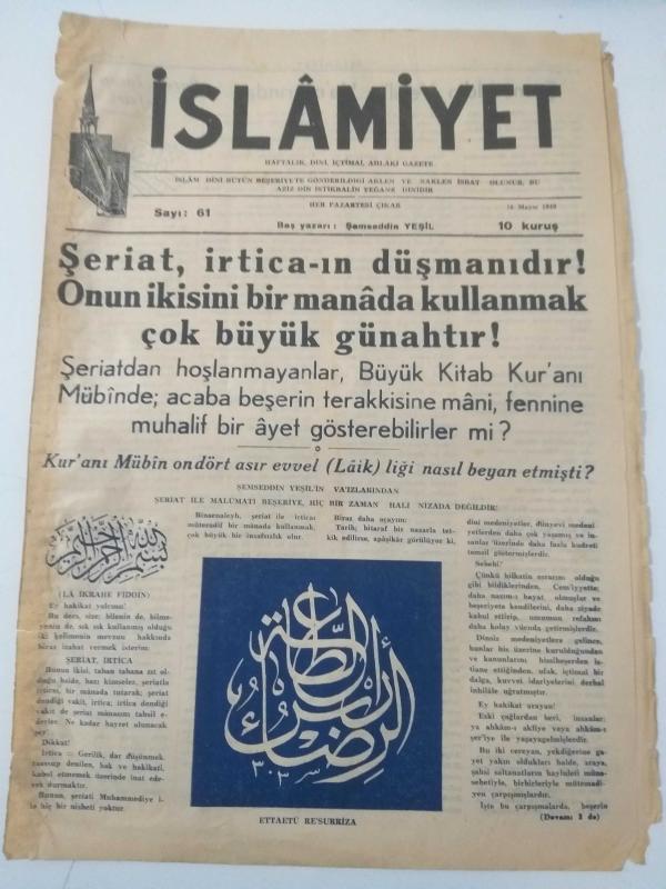 İSLAMİYET Haftalık, Dini, İçtimai, Ahlaki Gazete, 16 Mayıs 1949, Sayı:61 ( Baş Yazarı: Şemseddin Yeşil ) - 28.5/40 cm., Baş Yazarı: Şemseddin Yeşil tarafından kaleme alınmıştır. Kitap 1949 yılında KUTAY MATBAASI tarafından [İSTANBUL] yayınlanmıştır. 4 sayfadır. İSLAMİYET Haftalık, Dini, İçtimai, Ahlaki Gazete, 16 Mayıs 1949, Sayı:61 ( Baş Yazarı: Şemseddin Yeşil ) - 28.5/40 cm. adlı eser Türkçe dilindedir.