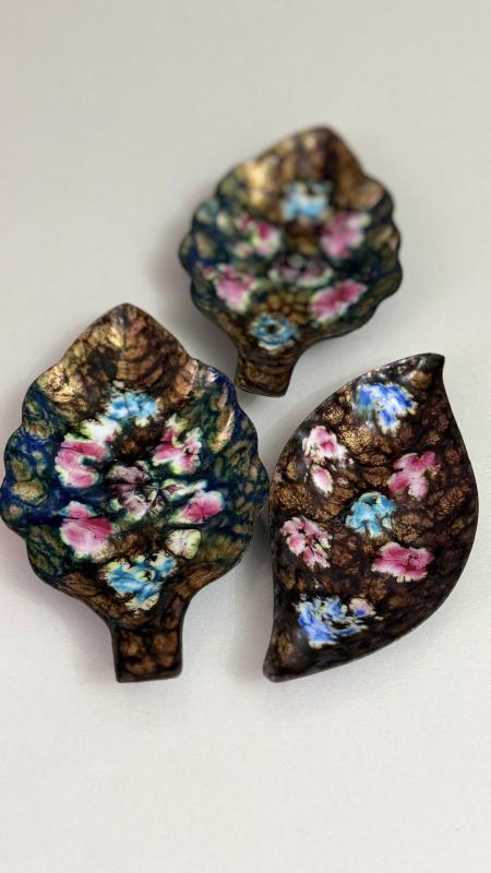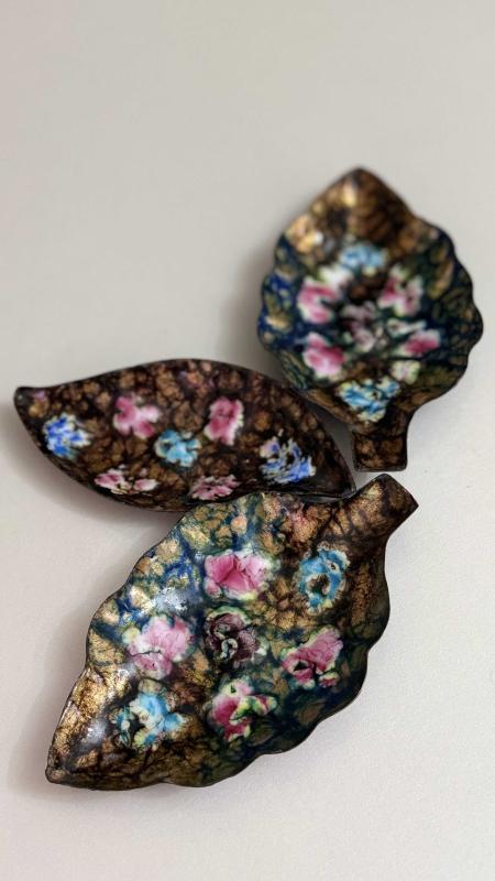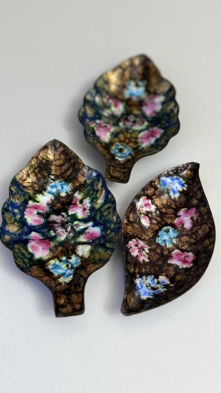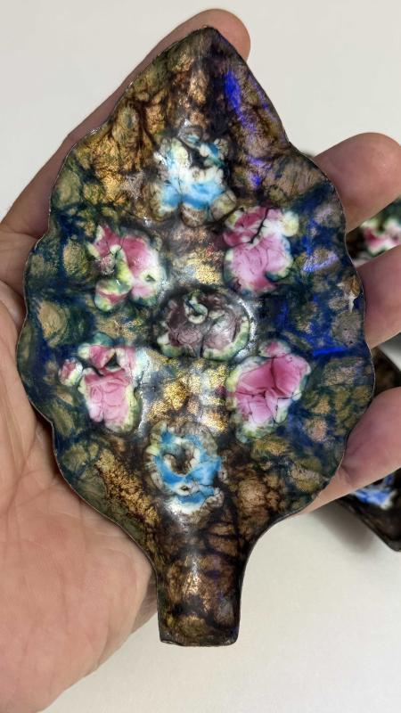 1950 60 LAR dönemi İspanya menşeyi bakır üzeri kabartma emaye 3 adet kusursuz tertemiz nadir Nadide eser SUNUMLUK çerezlik lokum luk nadir çıkar tertemiz 3 parça birden takım yaprak 🍁 formunda