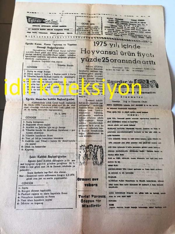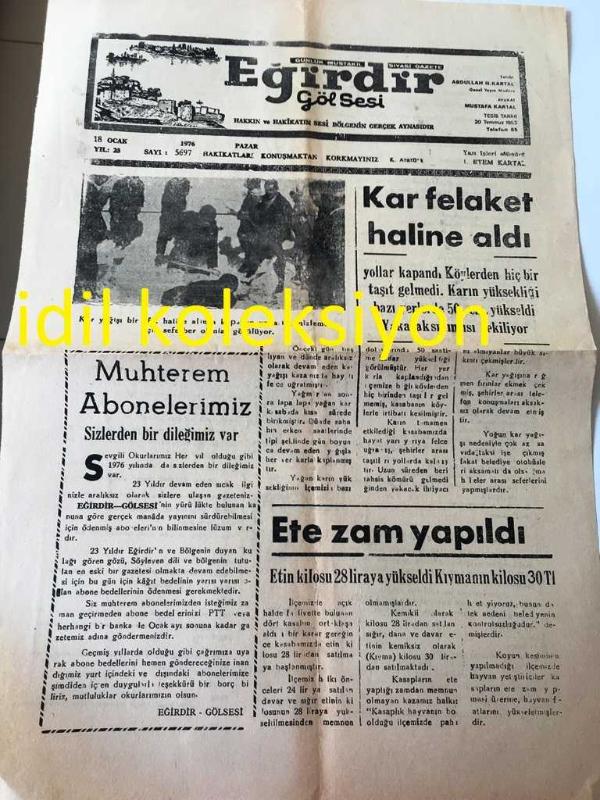 ISPARTA EĞİRDİR GÖL SESİ GAZETESİ YEREL TAŞRA BASINI ----18 Ocak 1976 Yıl :23 Sayı :5697--Kar felaket haline aldı -Ete zam yapıldı --1975 yılı içinde hayvansal ürün fiyatı yüzde 25 oranında arttı -- Yıpranma, sararmalar, kupon kesiği ve yırtılmalar zamana bağlı olarak görülebilir.