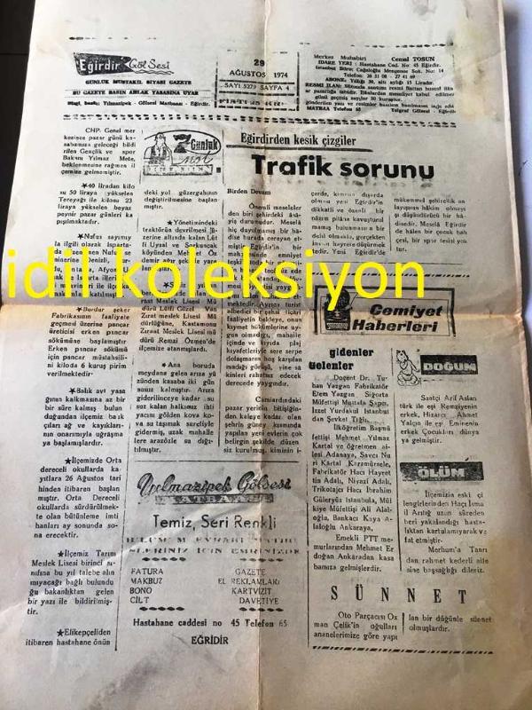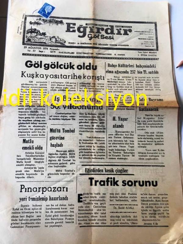 ISPARTA EĞİRDİR GÖL GESİ GAZETESİ YEREL TAŞRA BASINI ----29 Ağustos 1974 Yıl :22 Sayı :5279--Göl gölcük oldu --İş Bankasının 50. Yıl dönümü --Bahçe Kültürleri Bahçesindeki Elma Ağacında 257 Bin Tl Satıldı --Yunan Emperyalizmi Girit Kıbrıs :Beria Remzi Özoran --Eğirdir ve Yöresi Folkloru Türkü Mani Koşma Ezgi ve Danslar :Cemal Tosun --Trafik Sorunu -- Yıpranma, sararmalar, kupon kesiği ve yırtılmalar zamana bağlı olarak görülebilir.