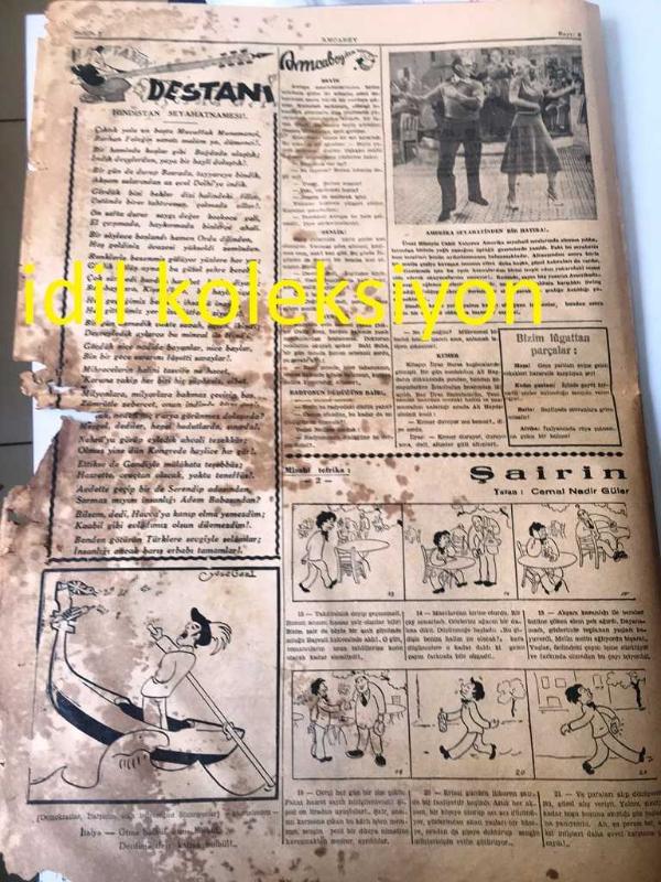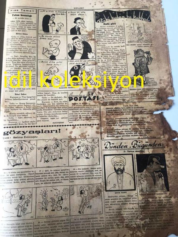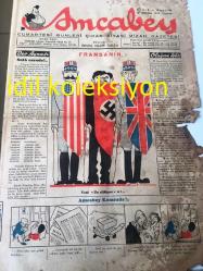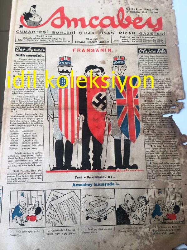 İSTANBUL AMCABEY SİYASİ MİZAH GAZETESİ YEREL TAŞRA BASINI ---- 23 İkinci Kanun 1943 Cilt :1 Sayı :8-- Dert aynası Sulh Nerede--Hindistan Seyahatnamesi --Gözyaşları :Selma Emiroğlu --Şeyh Vasfi ---Esat Mahmut Karakurt -- Yıpranma, sararmalar, kupon kesiği ve yırtılmalar zamana bağlı olarak görülebilir.