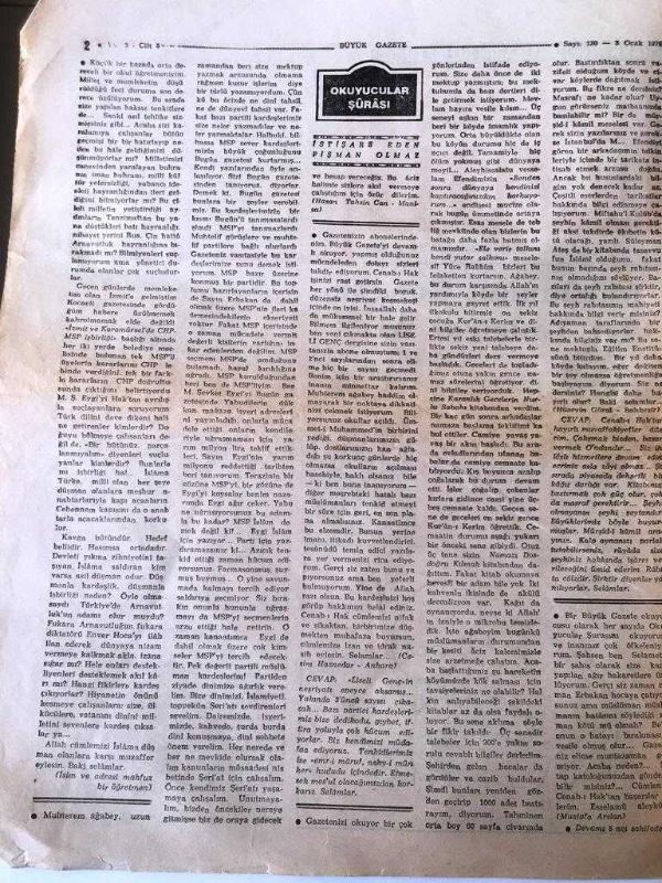 İSTANBUL BÜYÜK GAZETE HAKKIN VE HAKLILARIN HİZMETİNDE YEREL TAŞRA BASINI -3 OCAK 1979 SAYI :120 YIL :3 -Müslüman Gençlik İyi Yetişiyor mu? Tevhid Gazetesi Çıktı -Görüşler İran Hadiseleri ve Biz M. Ş . Eygi - Kudüs 'te Salahaddin Eyyubi İslam Üniversitesi Talimatnamesi - Rus Gemilerini Nasıl Gezdim S. Vasıf Eryılmaz- Ey Adem Oğlu -Tarihçi Gözüyle Dinin Ehemmiyeti : Prof. Dr. Osman Turan -Uzayda Siyah Delikler A. Arpacı - Muhammed İkbalden Hikmetler - İslam Halifesi İçin Londra da Dua Günü - Ehl-i Kıbleyi Tekfir Eden Kafir Olur - Din ve basın : Hekimoğlu İsmail - Yıpranma, sararmalar, kupon kesiği ve yırtılmalar zamana bağlı olarak görülebilir.