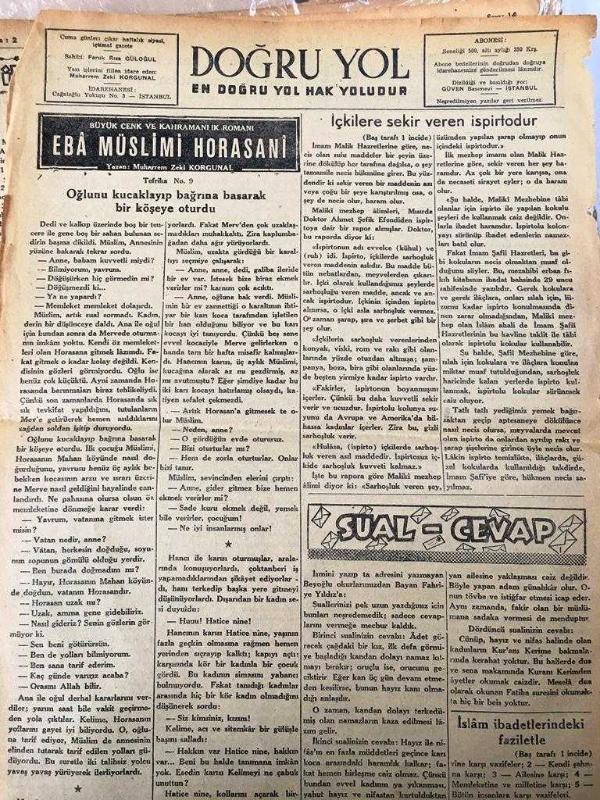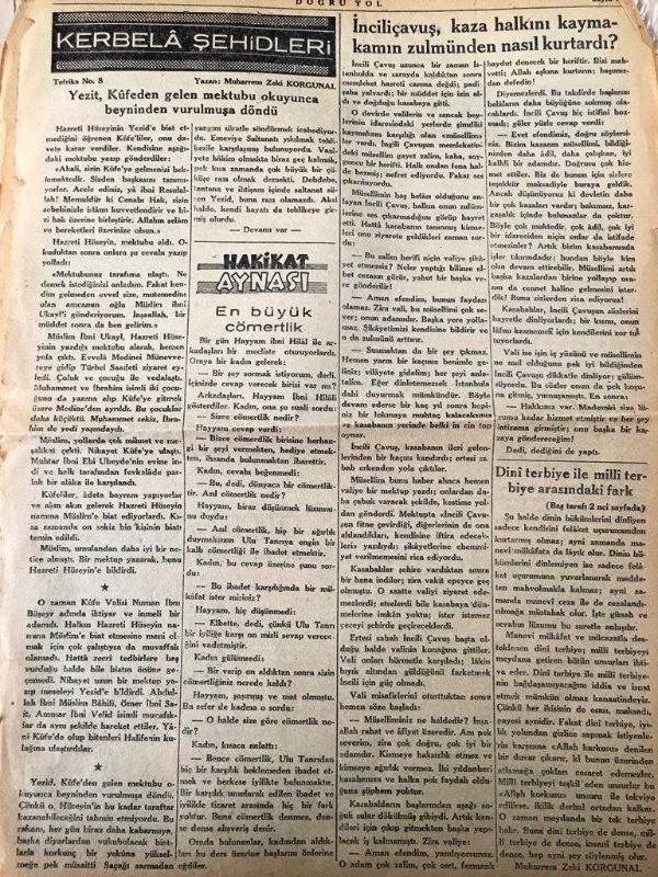 İSTANBUL DOĞRU YOL GAZETESİ YEREL TAŞRA BASINI - 17 Ekim 1947-YIL :1 SAYI 14-Besleme - İslam İbadetlerindeki Faziletler ve ahlaki vazifeler yazan : Fındıklı Hatibi Mustafa - İçkilerde sekir veren asıl madde ispirtodur - İbadet Ayrı ayrı beş vakit namaz - Dini Terbiye ile Milli Terbiye Arasındaki Fark -İtikat Meleklere Nasıl İman Edilir ? Eba Müslimi Horasani Yazan : Muharrem Zeki Korgunal - İçkilere Sekir veren ispirtodur -- Kerbela Şehitleri Yazan : Muharrem Zeki Korgunal Yezit Küfeden Gelen Mektubu Okuyunca Beyninden Vurulmuşa Döndü - İnciliçavuş , kaza halkını kaymakamın zülmunden nasıl kurtardı ?, Faruk Rıza Güloğlu tarafından kaleme alınmıştır. Kitap 1946 yılında [Güven MATBAASI ] yayınlanmıştır. 4 sayfadır. İSTANBUL DOĞRU YOL GAZETESİ YEREL TAŞRA BASINI - 17 Ekim 1947-YIL :1 SAYI 14-Besleme - İslam İbadetlerindeki Faziletler ve ahlaki vazifeler yazan : Fındıklı Hatibi Mustafa - İçkilerde sekir veren asıl madde ispirtodur - İbadet Ayrı ayrı beş vakit namaz - Dini Terbiye ile Milli Terbiye Arasındaki Fark -İtikat Meleklere Nasıl İman Edilir ? Eba Müslimi Horasani Yazan : Muharrem Zeki Korgunal - İçkilere Sekir veren ispirtodur -- Kerbela Şehitleri Yazan : Muharrem Zeki Korgunal Yezit Küfeden Gelen Mektubu Okuyunca Beyninden Vurulmuşa Döndü - İnciliçavuş , kaza halkını kaymakamın zülmunden nasıl kurtardı ? adlı eser Türkçe dilindedir.
