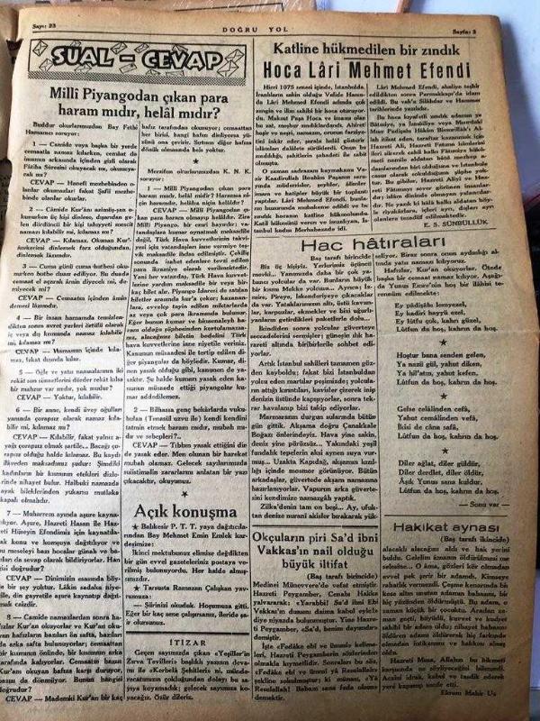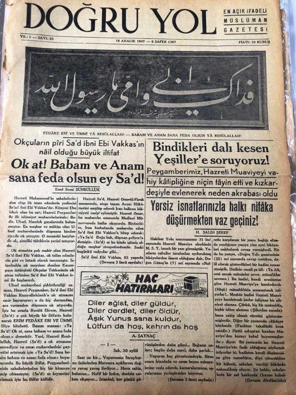 İSTANBUL DOĞRU YOL GAZETESİ YEREL TAŞRA BASINI - 19 Aralık 1947-Yıl :1 SAYI :23 - Ok at ! Babam ve anam sana feda olsun ey Sa'd !- Bindikleri dalı kesen Yeşillere 'e soruyoruz ? H. Salih Şeref - Kur 'anı Kerim Dersleri - Hakikat Aynası : Hazreti Musa 'ya Aczini İdrak Ettiren Bir Hadise - -- Milli piyangodan çıkan para haram mıdır , helal mıdır ? - Katline hükmedilen bir zındık Hoca lari Mehmet Efendi - Eba Müslimi Horasani - Bindikleri dalı kesen Yeşiller 'e soruyoruz - Yıpranma, sararmalar, kupon kesiği ve yırtılmalar zamana bağlı olarak görülebilir.