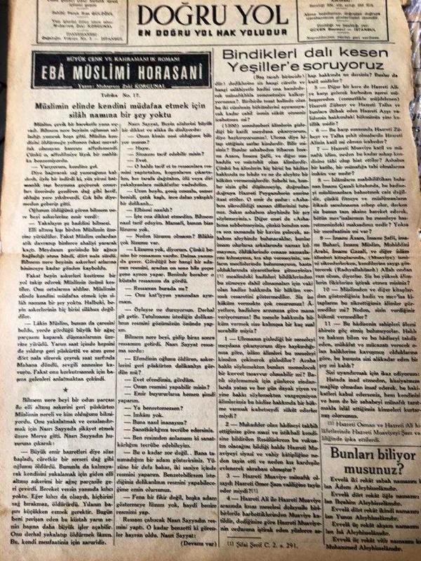 İSTANBUL DOĞRU YOL GAZETESİ YEREL TAŞRA BASINI - 19 Aralık 1947-Yıl :1 SAYI :23 - Ok at ! Babam ve anam sana feda olsun ey Sa'd !- Bindikleri dalı kesen Yeşillere 'e soruyoruz ? H. Salih Şeref - Kur 'anı Kerim Dersleri - Hakikat Aynası : Hazreti Musa 'ya Aczini İdrak Ettiren Bir Hadise - -- Milli piyangodan çıkan para haram mıdır , helal mıdır ? - Katline hükmedilen bir zındık Hoca lari Mehmet Efendi - Eba Müslimi Horasani - Bindikleri dalı kesen Yeşiller 'e soruyoruz -, Faruk Rıza Güloğlu tarafından kaleme alınmıştır. Kitap 1946 yılında [Güven MATBAASI ] yayınlanmıştır. 4 sayfadır. İSTANBUL DOĞRU YOL GAZETESİ YEREL TAŞRA BASINI - 19 Aralık 1947-Yıl :1 SAYI :23 - Ok at ! Babam ve anam sana feda olsun ey Sa'd !- Bindikleri dalı kesen Yeşillere 'e soruyoruz ? H. Salih Şeref - Kur 'anı Kerim Dersleri - Hakikat Aynası : Hazreti Musa 'ya Aczini İdrak Ettiren Bir Hadise - -- Milli piyangodan çıkan para haram mıdır , helal mıdır ? - Katline hükmedilen bir zındık Hoca lari Mehmet Efendi - Eba Müslimi Horasani - Bindikleri dalı kesen Yeşiller 'e soruyoruz - adlı eser Türkçe dilindedir.