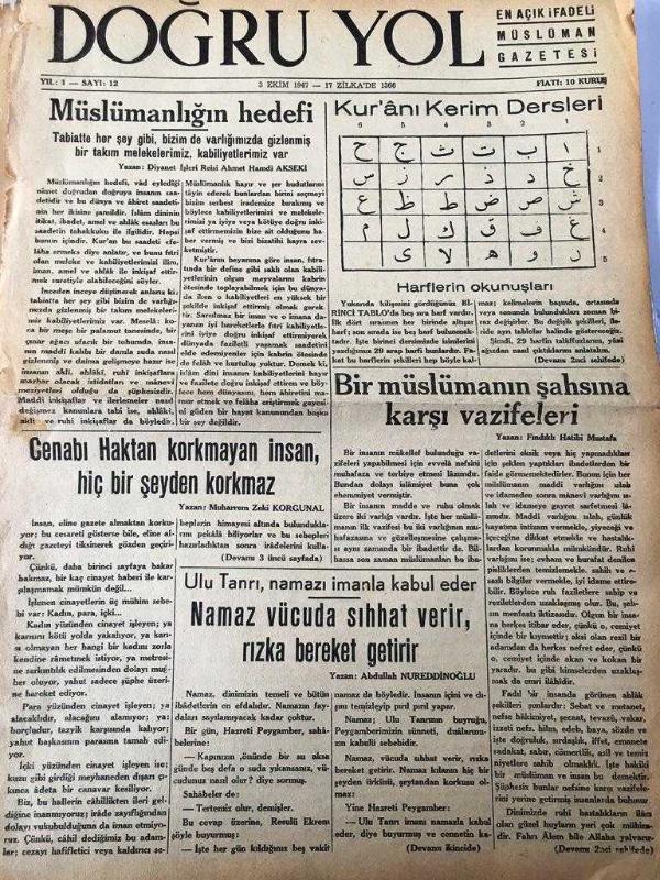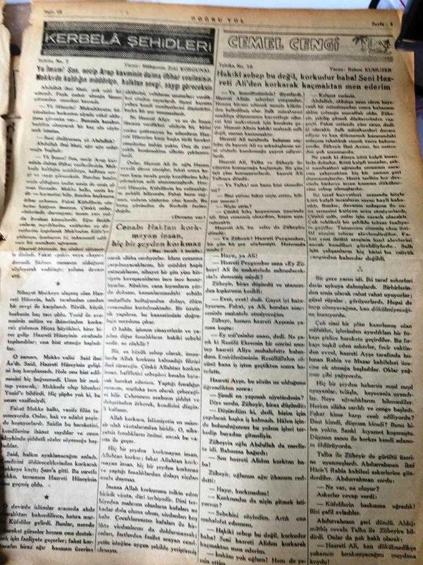 İSTANBUL DOĞRU YOL GAZETESİ YEREL TAŞRA BASINI - 3 Ekim 1947- YIL :1 SAYI :12 --Müslümanlığın Hedefi - Cenebı Haktan Korkmayan İnsan , Hiç bir şeyden korkmaz yazan Muharrem Zeki Korgunal- Bir Müslümanın Şahsına Karşı Vazifeleri Yazan Fındıklı Hatibi Mustafa - Namaz vücuda sıhhat verir , rızka bereket getirir , yazan :Abdullah Nureddinoğlu - Hadis-i Şerif Diyor ki : -Kur 'anı Kerim Dersleri - Kerbela Şehitleri Yazan : Muharrem Zeki Korgunal -Cemel Cengi Yazan : Rahmi Kumuzer -. Hakiki sebep değil , korkudur baba! Seni Hazreti Ali 'den korkarak kaçmaktan men ederim - Eba Müslimi Horasani : Yazan : Muharrem Zeki Korgunal - İslam da sonradan konulan güzel usüller yazan : Esat Sezai Sünbüllük -, Faruk Rıza Güloğlu tarafından kaleme alınmıştır. Kitap 1946 yılında [Güven MATBAASI ] yayınlanmıştır. 4 sayfadır. İSTANBUL DOĞRU YOL GAZETESİ YEREL TAŞRA BASINI - 3 Ekim 1947- YIL :1 SAYI :12 --Müslümanlığın Hedefi - Cenebı Haktan Korkmayan İnsan , Hiç bir şeyden korkmaz yazan Muharrem Zeki Korgunal- Bir Müslümanın Şahsına Karşı Vazifeleri Yazan Fındıklı Hatibi Mustafa - Namaz vücuda sıhhat verir , rızka bereket getirir , yazan :Abdullah Nureddinoğlu - Hadis-i Şerif Diyor ki : -Kur 'anı Kerim Dersleri - Kerbela Şehitleri Yazan : Muharrem Zeki Korgunal -Cemel Cengi Yazan : Rahmi Kumuzer -. Hakiki sebep değil , korkudur baba! Seni Hazreti Ali 'den korkarak kaçmaktan men ederim - Eba Müslimi Horasani : Yazan : Muharrem Zeki Korgunal - İslam da sonradan konulan güzel usüller yazan : Esat Sezai Sünbüllük - adlı eser Türkçe dilindedir.