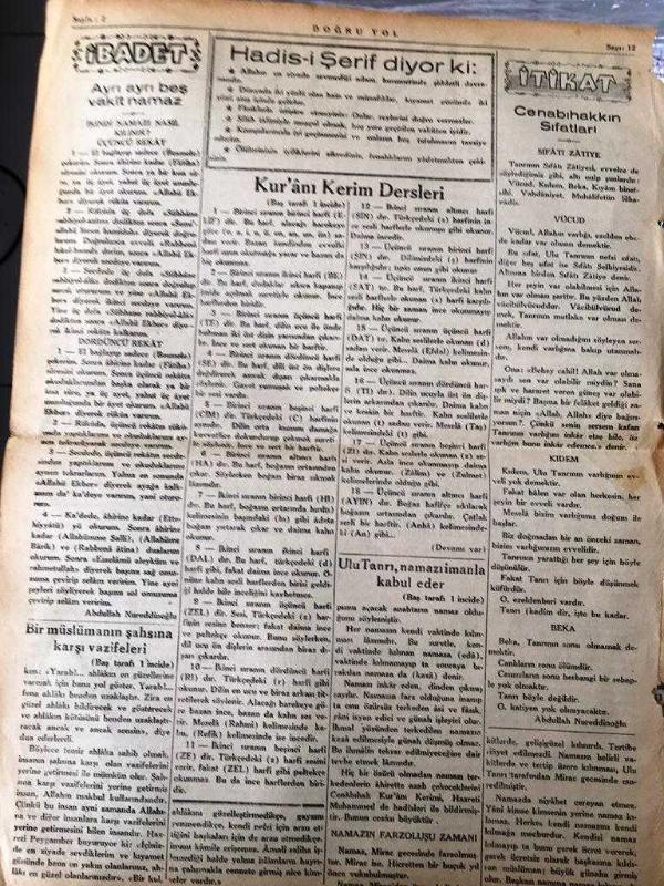 İSTANBUL DOĞRU YOL GAZETESİ YEREL TAŞRA BASINI - 3 Ekim 1947- YIL :1 SAYI :12 --Müslümanlığın Hedefi - Cenebı Haktan Korkmayan İnsan , Hiç bir şeyden korkmaz yazan Muharrem Zeki Korgunal- Bir Müslümanın Şahsına Karşı Vazifeleri Yazan Fındıklı Hatibi Mustafa - Namaz vücuda sıhhat verir , rızka bereket getirir , yazan :Abdullah Nureddinoğlu - Hadis-i Şerif Diyor ki : -Kur 'anı Kerim Dersleri - Kerbela Şehitleri Yazan : Muharrem Zeki Korgunal -Cemel Cengi Yazan : Rahmi Kumuzer -. Hakiki sebep değil , korkudur baba! Seni Hazreti Ali 'den korkarak kaçmaktan men ederim - Eba Müslimi Horasani : Yazan : Muharrem Zeki Korgunal - İslam da sonradan konulan güzel usüller yazan : Esat Sezai Sünbüllük - Yıpranma, sararmalar, kupon kesiği ve yırtılmalar zamana bağlı olarak görülebilir.