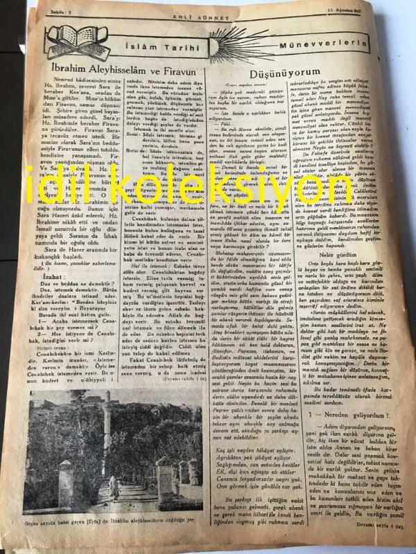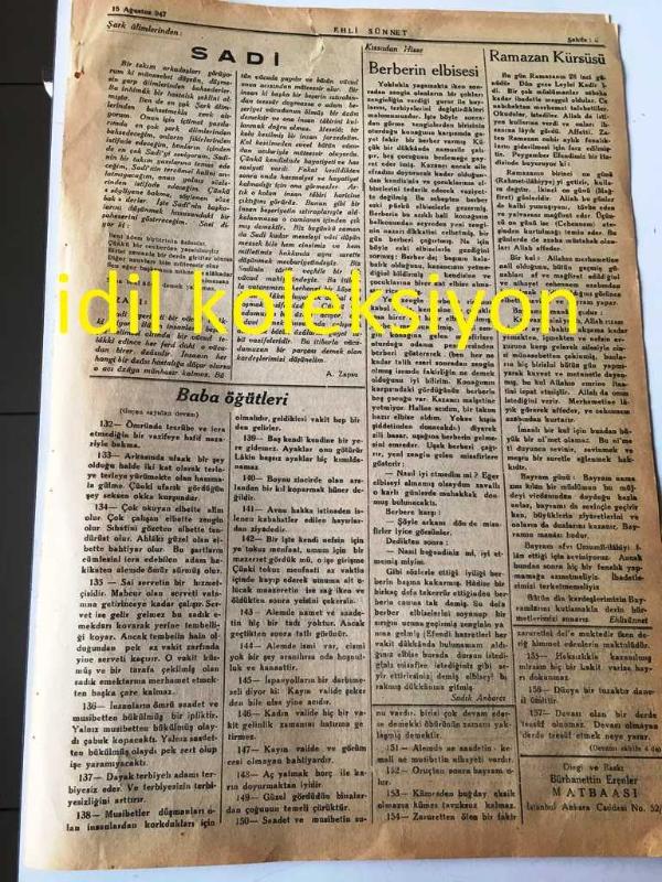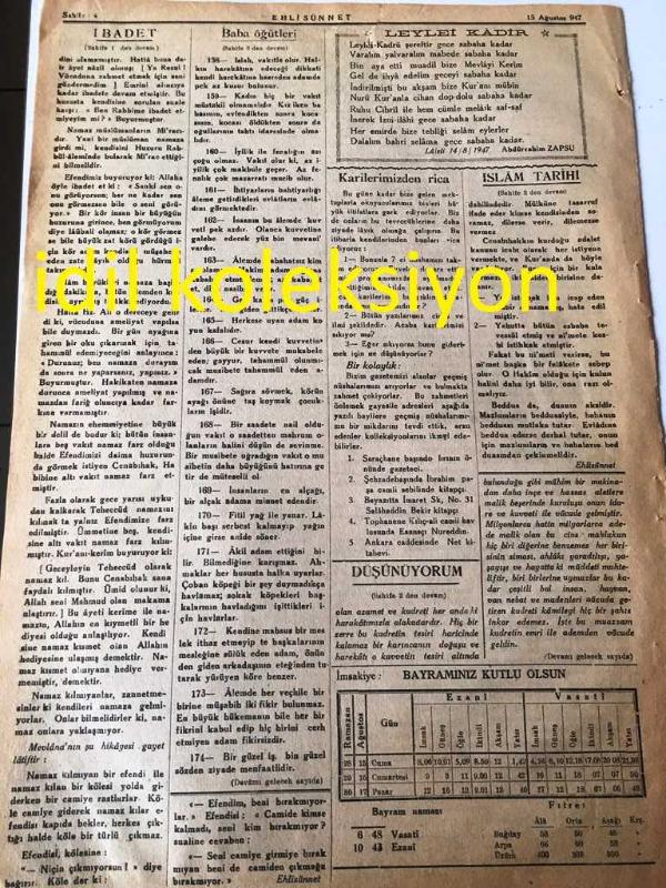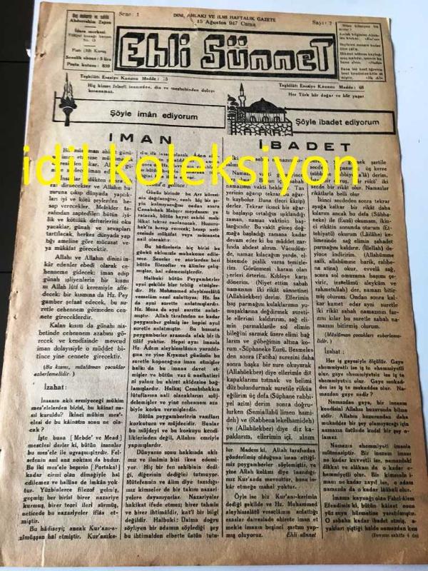 İSTANBUL EHLİ SÜNNET GAZETESİ YEREL TAŞRA BASINI ---15 Ağustos 1947 Sayı :7 Yıl :1--İman --İbadet --İslam Tarihi :İbrahim Aleyhisselam ve Firavun --Düşünüyorum --Sadi--Baba Öğütleri --Ramazan Kürsüsü-- Yıpranma, sararmalar, kupon kesiği ve yırtılmalar zamana bağlı olarak görülebilir.