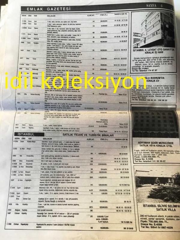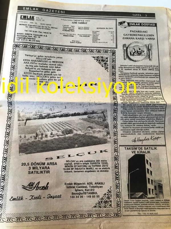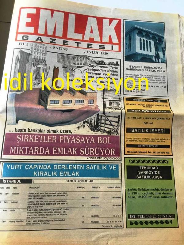 İSTANBUL EMLAK GAZETESİ YEREL TAŞRA BASINI ---Eylül 1989 Yıl :2 Sayı :43--Normlara uygun malzeme ile üretilen konutları satanda alanda rahat ediyor --Yeni açılacak toplu konut kredilerinin verilmesi uzuyor :Mahmut Arslan --Suyun en sağlıklı iletimi serüveninde filitrasyonun önemi -----Şirketler piyasaya bol miktarda emlak sürüyor --Kooperatifçilikte şimdi güvene dayalı yeni bir dönem başlıyor -- Yıpranma, sararmalar, kupon kesiği ve yırtılmalar zamana bağlı olarak görülebilir.