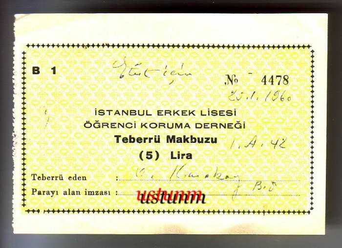 ** İSTANBUL ERKEK LİSESİ ÖĞRENCİ KORUMA DERNEĞİ TEBERRÜ MAKBUZU ** 13 x 9 cm.ebadında ve gayet temiz durumda, 25 Ocak 1960 tarihli teberru makbuzudur...