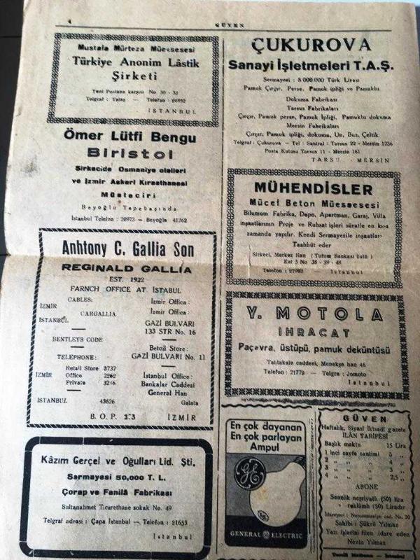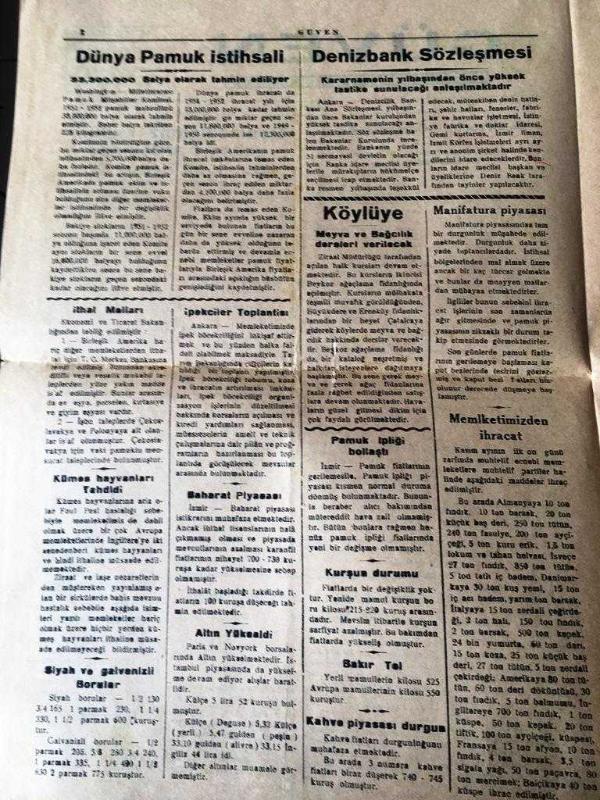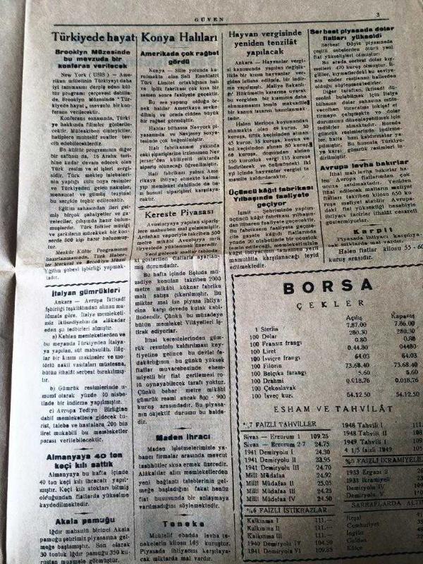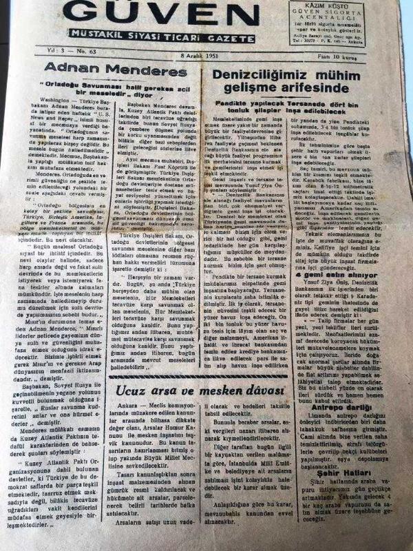 İSTANBUL GÜVEN GAZETESİ YEREL TAŞRA BASINI- 8 ARALIK 1951 YIL :3 - Adnan Menderes- Denizciliğimizin mühim gelişme arifesinde - Ucuz arsa ve mesken davası -Dünya Pamuk İhtihsali - İpekçiler toplantısı - Kümes hayvanları tehdidi - Denizbank Sözleşmesi - Türkiye de Hayat - Konya Halıları - Serbest piyasada dolar fiyatları yükseldi - Yıpranma, sararmalar, kupon kesiği ve yırtılmalar zamana bağlı olarak görülebilir.