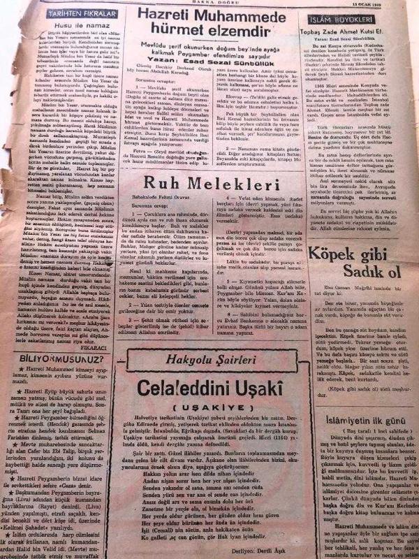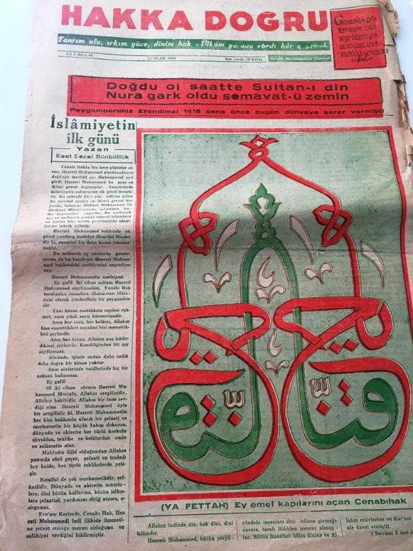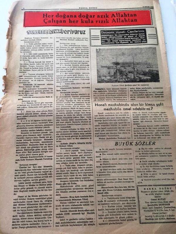 İSTANBUL HAKKA DOĞRU GAZETESİ YEREL TAŞRA BASINI TANRIM ULU IRKIM YÜCE,DİNİM HAK -ÜLKÜM YURDA EDEBİ HÜR YAŞAMAK --13 Ocak 1949 Yıl :2 Sayı :98- Peygamber efendimiz 1418 sene önce bugün dünyaya şeref vermiştir - İslamiyet'in ilk günü yazan : Esat Sezai Sünbüllük --Tarihten Fıkralar :Husu ile Namaz -- Hz Muhammed 'e hürmet elzemdir - Ruh Melekleri - Hak yolu şairleri :Celaleddini Uşaki - İslam Büyükleri :Topbaş Zade Ahmet Kutsi Ef - Köpek gibi sadık ol- Uhut Gazası :yazan :K.Samancıgil --İslam şimdi Muhammedin ilk işe başladığı halde değil --Cuma Hutbeleri hayvana şefkat --Hanefi mezhebinde olan bir kimse şafi mezhebine amel edebilir mi ? Yıpranma, sararmalar, kupon kesiği ve yırtılmalar zamana bağlı olarak görülebilir.