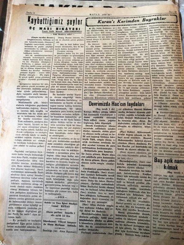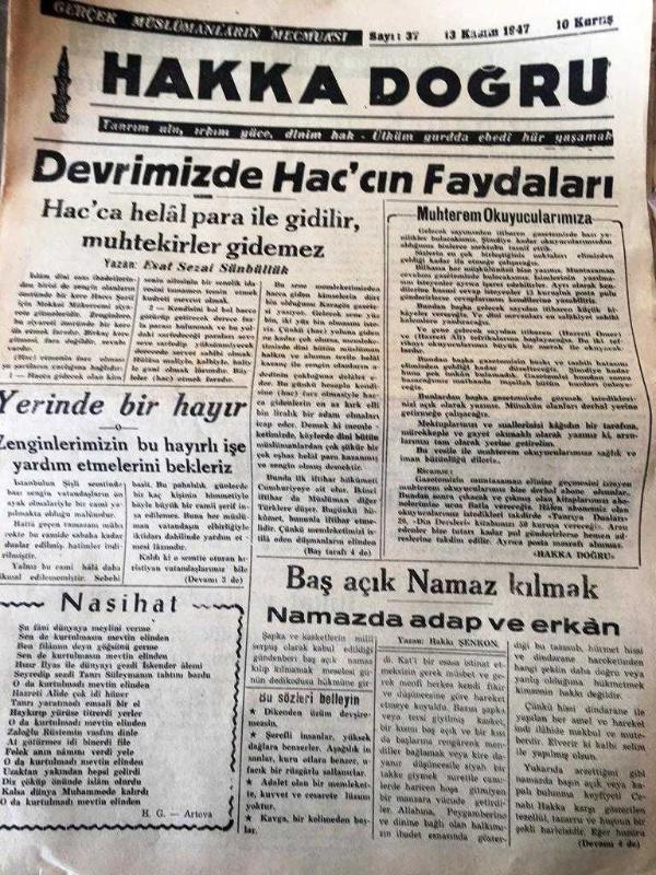 İSTANBUL HAKKA DOĞRU GERÇEK MÜSLÜMANLARIN MECMUASI TANRIM ULU, IRKIM YÜCE, DİNİM HAK ÜLKÜ YURDA EDEBİ HÜR YAŞAMAK - Devrimizde Hac'cın Faydaları Hac'ca helal para ile gidilir , muhtekirler gidemez yazan : Esat Sezai Sünbüllük - Yerinde bir hayır zenginlerimizin bu hayırlı işe yardım etmelerini bekleriz - Muhterem Okuyucularımıza -Baş açık namaz kılmak Namazda adap ve erkan yazan : Hakkı Şenkon-Dinimizin Esasları : Namaz Nasıl Kılınır ? Bu sütunlarda dinimizin esaslarını tam ve eksiksiz olarak bulacaksınız - Peygamberimizin Şefkati Sevgilil kızı Hazreti Fatma 'nın öğütmekten elleri şişmiş peygamberimizden yardımcı istemişti -- AHVALİMİZ İ.H.Piroğlu - Karşılaştığımız Tehlikeler MASONLUK Yazan : General Kazım Karabekir -Kulağınıza Küpe Olsun ! Milyonları Kurtaran İnsan -Seçme Şiirler Müslüman Diyarı Karşısında Mehmet Akif -Kaybettiğimiz Şeyler Üç Mazi Hikayesi Yazan : Galip Kemali Söylemezoğlu -Kuranı Kerimden Buyruklar -, CEMAL KUTAY tarafından kaleme alınmıştır. Kitap 1947 yılında [Sinan MATBAASI ] yayınlanmıştır. 4 sayfadır. İSTANBUL HAKKA DOĞRU GERÇEK MÜSLÜMANLARIN MECMUASI TANRIM ULU, IRKIM YÜCE, DİNİM HAK ÜLKÜ YURDA EDEBİ HÜR YAŞAMAK - Devrimizde Hac'cın Faydaları Hac'ca helal para ile gidilir , muhtekirler gidemez yazan : Esat Sezai Sünbüllük - Yerinde bir hayır zenginlerimizin bu hayırlı işe yardım etmelerini bekleriz - Muhterem Okuyucularımıza -Baş açık namaz kılmak Namazda adap ve erkan yazan : Hakkı Şenkon-Dinimizin Esasları : Namaz Nasıl Kılınır ? Bu sütunlarda dinimizin esaslarını tam ve eksiksiz olarak bulacaksınız - Peygamberimizin Şefkati Sevgilil kızı Hazreti Fatma 'nın öğütmekten elleri şişmiş peygamberimizden yardımcı istemişti -- AHVALİMİZ İ.H.Piroğlu - Karşılaştığımız Tehlikeler MASONLUK Yazan : General Kazım Karabekir -Kulağınıza Küpe Olsun ! Milyonları Kurtaran İnsan -Seçme Şiirler Müslüman Diyarı Karşısında Mehmet Akif -Kaybettiğimiz Şeyler Üç Mazi Hikayesi Yazan : Galip Kemali Söylemezoğlu -Kuranı Kerimden Buyruklar - adlı eser Türkçe dilindedir.
