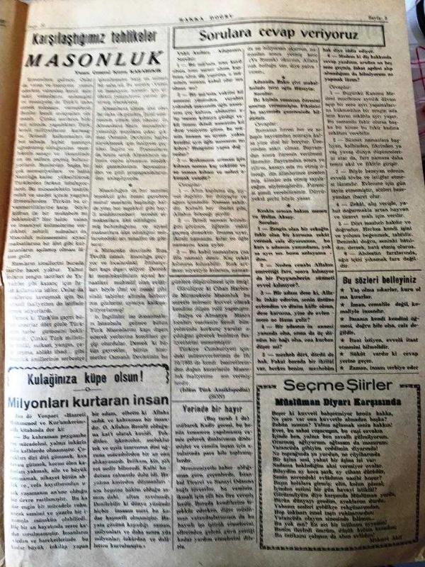 İSTANBUL HAKKA DOĞRU GERÇEK MÜSLÜMANLARIN MECMUASI TANRIM ULU, IRKIM YÜCE, DİNİM HAK ÜLKÜ YURDA EDEBİ HÜR YAŞAMAK - Devrimizde Hac'cın Faydaları Hac'ca helal para ile gidilir , muhtekirler gidemez yazan : Esat Sezai Sünbüllük - Yerinde bir hayır zenginlerimizin bu hayırlı işe yardım etmelerini bekleriz - Muhterem Okuyucularımıza -Baş açık namaz kılmak Namazda adap ve erkan yazan : Hakkı Şenkon-Dinimizin Esasları : Namaz Nasıl Kılınır ? Bu sütunlarda dinimizin esaslarını tam ve eksiksiz olarak bulacaksınız - Peygamberimizin Şefkati Sevgilil kızı Hazreti Fatma 'nın öğütmekten elleri şişmiş peygamberimizden yardımcı istemişti -- AHVALİMİZ İ.H.Piroğlu - Karşılaştığımız Tehlikeler MASONLUK Yazan : General Kazım Karabekir -Kulağınıza Küpe Olsun ! Milyonları Kurtaran İnsan -Seçme Şiirler Müslüman Diyarı Karşısında Mehmet Akif -Kaybettiğimiz Şeyler Üç Mazi Hikayesi Yazan : Galip Kemali Söylemezoğlu -Kuranı Kerimden Buyruklar - Yıpranma, sararmalar, kupon kesiği ve yırtılmalar zamana bağlı olarak görülebilir.