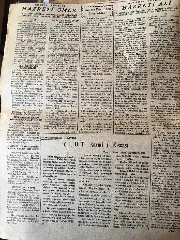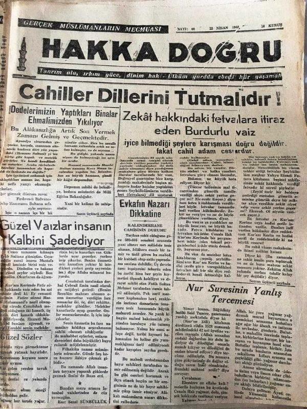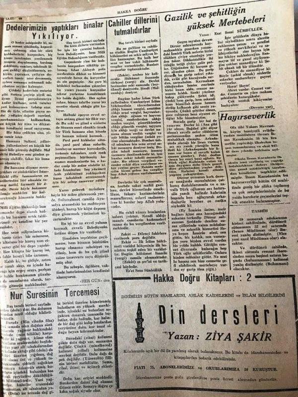 İSTANBUL HAKKA DOĞRU GERÇEK MÜSLÜMANLARIN MECMUASI TANRIM ULU, IRKIM YÜCE, DİNİM HAK ÜLKÜ YURDA EDEBİ HÜR YAŞAMAK - SAYI :60 - 22 Nisan 1948- Cahiller Dillerini Tutmalıdır '! Dedelerimizin yaptıkları binalar ihmalimizden yıkılıyor - Güzel Vaizler insanın kalbini şadediyor - Zekat hakkındaki fetvalara itiraz eden Burdurlu vaiz - Nur Suresinin Yanlış Tercemesi - HAZRETİ ÖMER - (LUT KAVMİ ) kıssası Yazan : Esat Sezai Sümbüllük - ALLAH'IN ARSLANI HAZRETİ ALİ - Gazilik ve Şehitliğin Yüksek Mertebeleri Yazan : Esat Sezai Sümbüllük - Din Dersleri yazan : Ziya Şakir - Cenaze namazı nasıl kılınır ? Yıpranma, sararmalar, kupon kesiği ve yırtılmalar zamana bağlı olarak görülebilir.