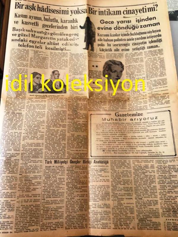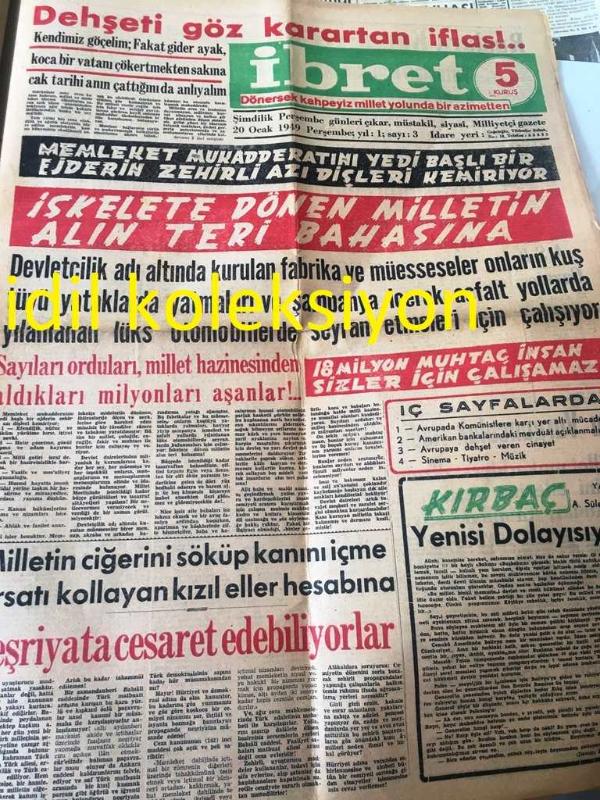 İSTANBUL İBRET GAZETESİ YEREL TAŞRA BASINI--20 OCAK 1949 Yıl :1 Sayı :3 ---Dehşeti göz karartan iflas --Sayıları orduları ,millet hazinesinden aldıkları milyonları aşanlar ---Ruslara Karşı Yeraltı -Savaşı Vatanları için kanlarını akıtan bu isimsiz kahramanları saygı ile selamlarız --16 yaşında oğlunu boğduran padişah Harem de köşe kapmaca oynayan şen cariyelerin şakrak çığlıkları geliyordu --Bir Yerli Film (Rezalet ) Çevriliyor :A. Baki Çallıoğlu ---Oskar Mükafatı ve Sinema Yıldızları :Metin Karamanbey ---Hollywood Dedikoduları :Türkan Özkan -- Yıpranma, sararmalar, kupon kesiği ve yırtılmalar zamana bağlı olarak görülebilir.