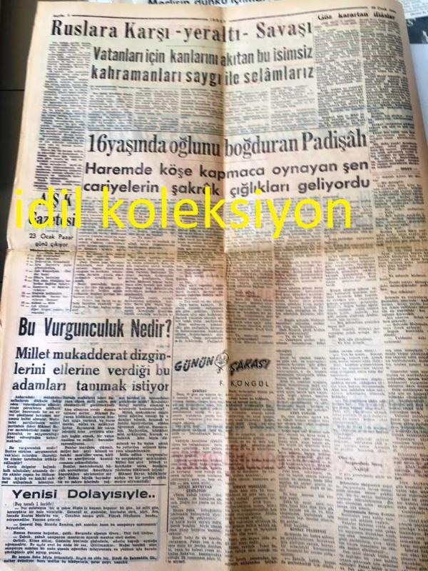 İSTANBUL İBRET GAZETESİ YEREL TAŞRA BASINI--20 OCAK 1949 Yıl :1 Sayı :3 ---Dehşeti göz karartan iflas --Sayıları orduları ,millet hazinesinden aldıkları milyonları aşanlar ---Ruslara Karşı Yeraltı -Savaşı Vatanları için kanlarını akıtan bu isimsiz kahramanları saygı ile selamlarız --16 yaşında oğlunu boğduran padişah Harem de köşe kapmaca oynayan şen cariyelerin şakrak çığlıkları geliyordu --Bir Yerli Film (Rezalet ) Çevriliyor :A. Baki Çallıoğlu ---Oskar Mükafatı ve Sinema Yıldızları :Metin Karamanbey ---Hollywood Dedikoduları :Türkan Özkan -- adlı eser, Kitap > Süreli Yayınlar > Gazeteler > Türkiye > Mahalli kategorisinde İkinci El olarak satıştadır.