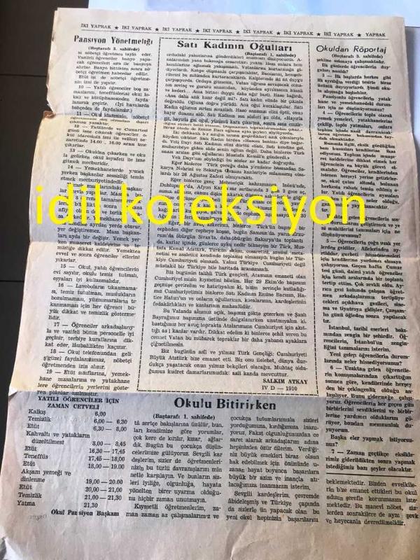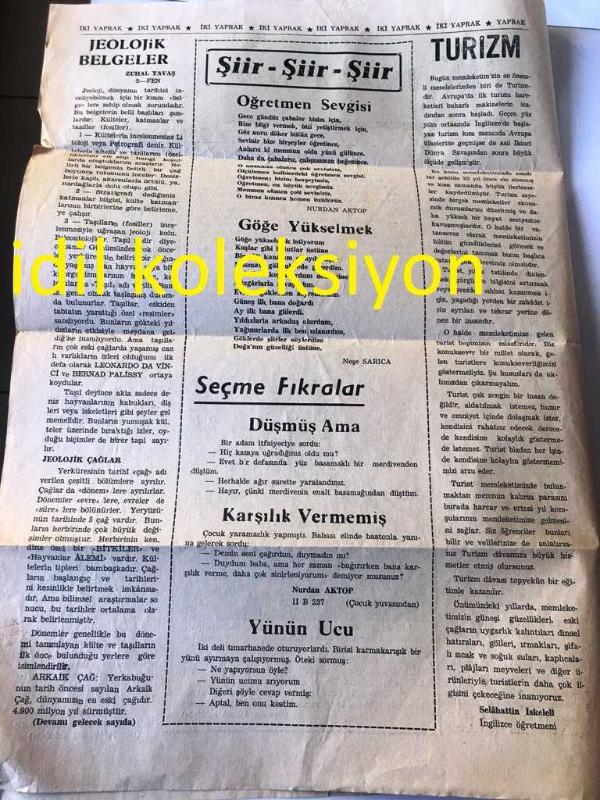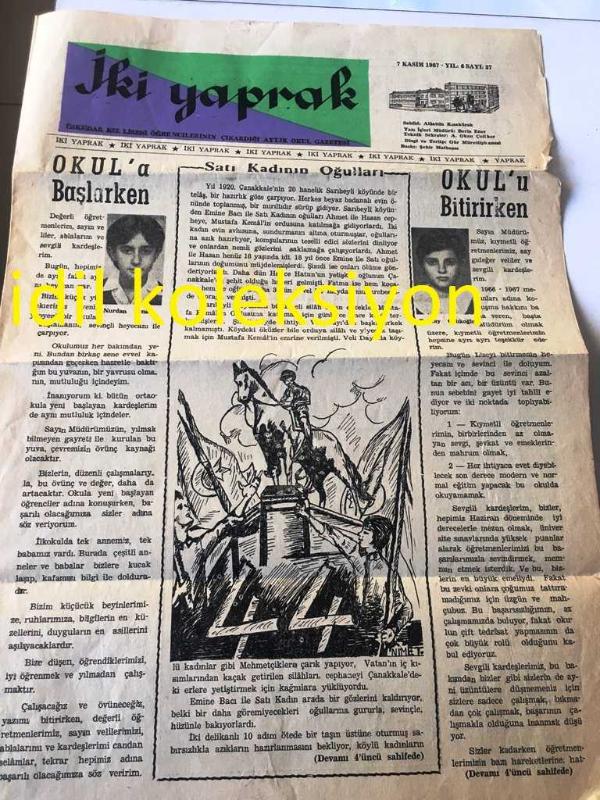 İSTANBUL İKİ YAPRAK GAZETESİ YEREL TAŞRA BASINI--7 KASIM 1967 YIL :6 SAYI :37--Okul 'a Başlarken --Satı Kadının Oğulları --Jeolojik Belgeler :Zuhal Yavaş --Şiir :Öğretmen Sevgisi :Nurdan Aktop , Göğe Yükselmek :Neşe Sarıca --Pansiyon Öğrenci Yönetmeliği-- Yıpranma, sararmalar, kupon kesiği ve yırtılmalar zamana bağlı olarak görülebilir.