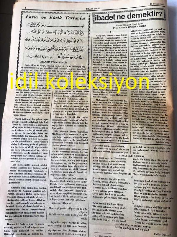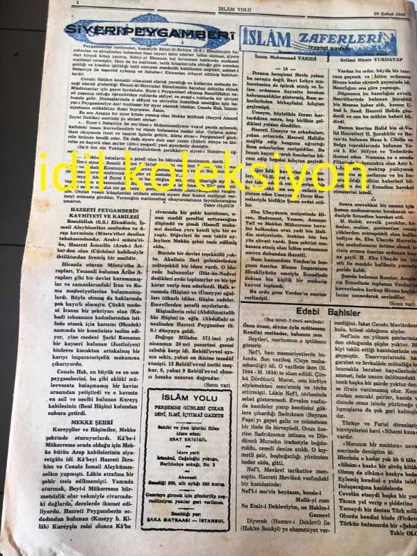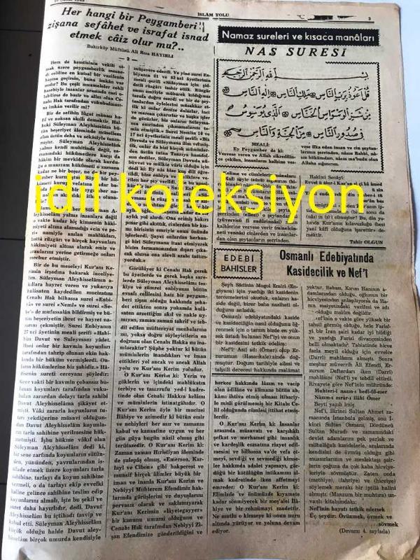 İSTANBUL İSLAM YOLU GAZETESİ YEREL TAŞRA BASINI ----10 Şubat 1949 Sayı :19 Yıl :1--İbadet ne demektir ? Yazan :Ahmet Hamdi Akseki --Her hangi bir Peygamber zişana sefahet ve israfat isnad etmek caiz olur mu ?--Osmanlı edebiyatında kasidecilik ve Nefi --Edebi Bahisler - Yıpranma, sararmalar, kupon kesiği ve yırtılmalar zamana bağlı olarak görülebilir.