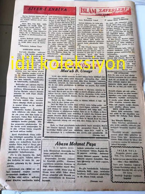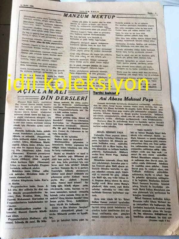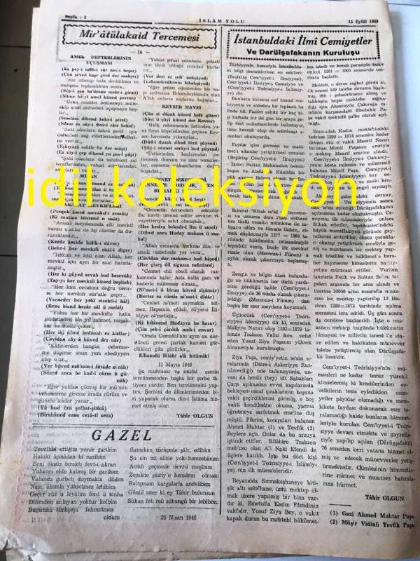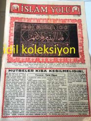 İSTANBUL İSLAM YOLU GAZETESİ YEREL TAŞRA BASINI ---15 Eylül 1949 SAYI :50 Yıl :1--Hutbeliler Kısa Kesilmelidir :Tahir Olgun --İstanbul da ki İlmi Cemiyetler ve Darülşafakanın Kuruluşu --Manzum Mektup :Tahir Olgun --Asi Abaza Mehmet Paşa --İslam da İlk Resmi Muallim -- Yıpranma, sararmalar, kupon kesiği ve yırtılmalar zamana bağlı olarak görülebilir.