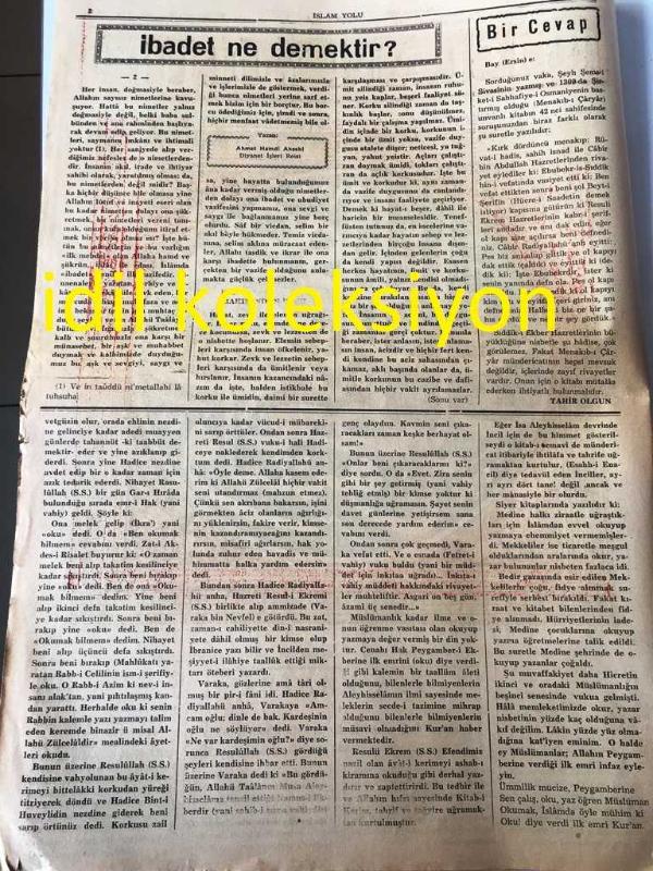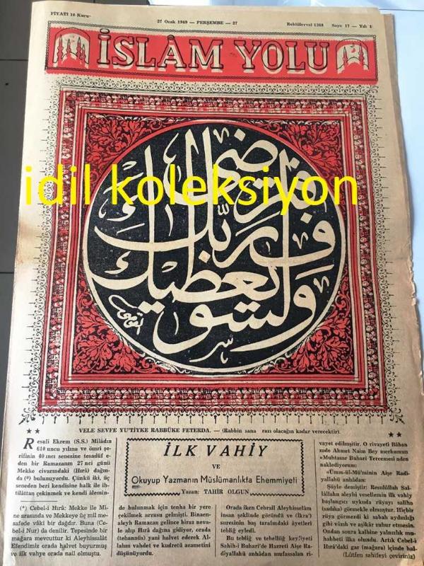 İSTANBUL İSLAM YOLU GAZETESİ YEREL TAŞRA BASINI ----27 Ocak 1949 Sayı :17 Yıl :1--İlk Vahiy ve Okuyup Yazmanın Müslümanlıkta Ehemmiyeti Yazan :Tahir Olgun --İbadet ne demektir ?--Ahmet Hamdi Akseki --İbni Sina Yazan :Cafer Ergin --Şeyh Sadinin Bir Moğol Emrine Yılbaşı Tebriki --Erken Kalk :Kilisli Celal Agah Uyanık--Ziya Paşa'nın Bir Gazaline Nazire --İslam Büyükleri :Ammar B. Yasir -- Yıpranma, sararmalar, kupon kesiği ve yırtılmalar zamana bağlı olarak görülebilir.