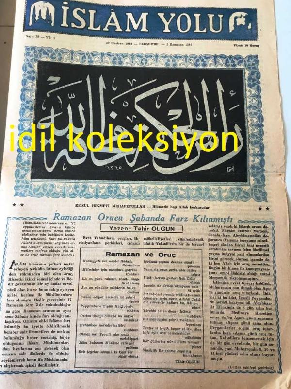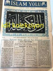 İSTANBUL İSLAM YOLU GAZETESİ YEREL TAŞRA BASINI -- ---30 Haziran 1949 Sayı :39 Yıl :1--Ramazan Orucu Şabanda Farz Kılınmıştır :Yazan :Tahir Olgun --Mir 'atülakaid Tercemesi --Eski Ramazan Dair --Ayıplanan Şey Mutlaka Başa Gelir --Bursalı Hekim Ali Efendi Yazan :Cevat Çelebioğlu --Müslüman Bir İngiliz 'in Fikri Yazan :Reşid Mazhar Ayda --İslam Büyükelçisi :Suheyb B. Sinanir Rumi -- Yıpranma, sararmalar, kupon kesiği ve yırtılmalar zamana bağlı olarak görülebilir.
