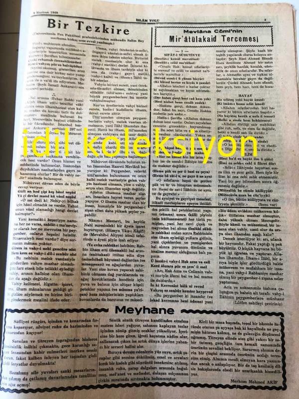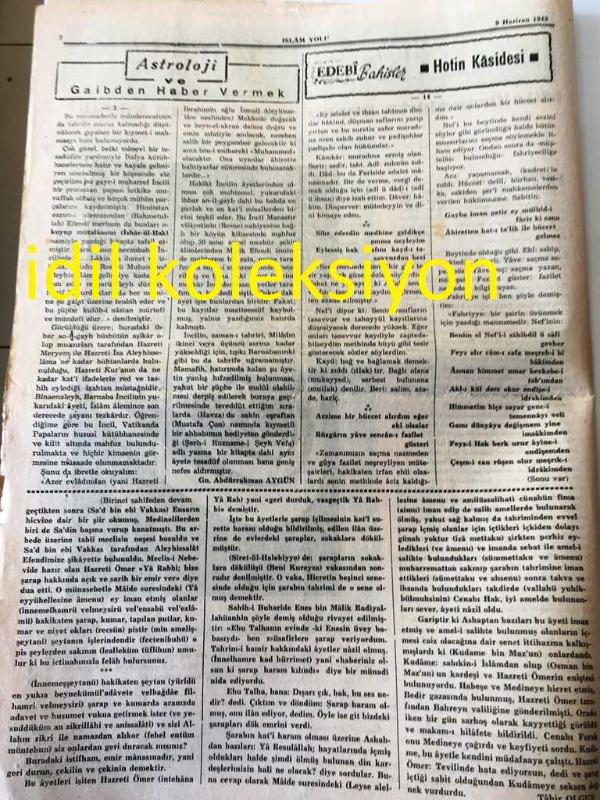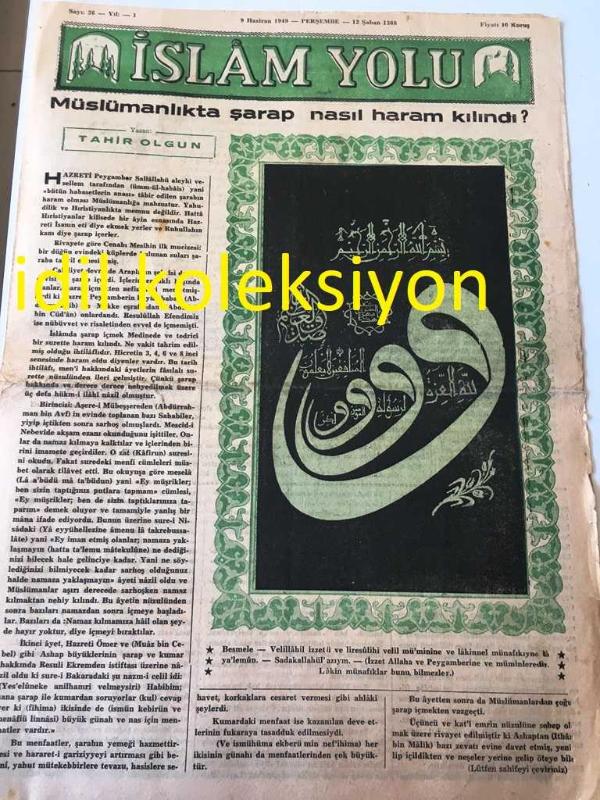 İSTANBUL İSLAM YOLU GAZETESİ YEREL TAŞRA BASINI -- ---9 Haziran 1949 Sayı :36 Yıl :1--Müslümanlıkta şarap nasıl haram kılındı ? Tahir Olgun --Astroloji Gaibden Haber Vermek --Bir Tezkire --Siyeri Peygamberi --Bahar ve Ağaç -- Yıpranma, sararmalar, kupon kesiği ve yırtılmalar zamana bağlı olarak görülebilir.