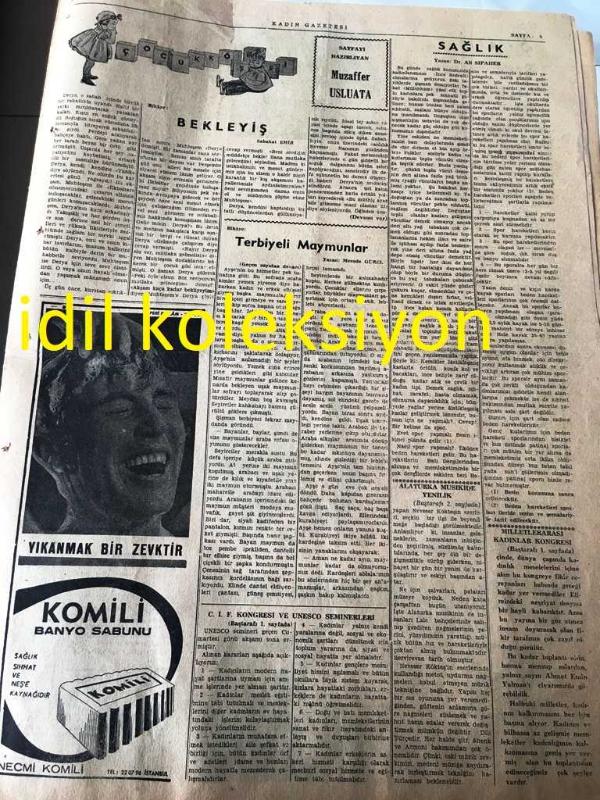 İSTANBUL KADIN GAZETESİ YEREL TAŞRA BASINI ---10 Eylül 1960 Yıl :14 Sayı :627--Kadınlar Mecburi sosyal eğitime tabi olmalıdır --C.İ.F Kongresi Unesco Seminerleri --Pakistan Delegeleri Başkanı Begüm Abdülgedir -Pakistan Sefirin Eşi Begüm Hasan --Amerikan İstanbul Başkonsolosu Amerika Tayin Oldu --Kadınlar Konseyinin ana prensibi :Muzaffer Usluata --Alaturka Musikide Yenilik :Salde Çalt --İzmir Fuarında Amerika Günü Kutlandı --Charıton Heston --Zeki Müren Sanat Zirvesindeki Mevkiini Edebiyen Muhafaza Edecektir ----Raşit Biçersoy --Terbiyeli Maymunlar :Yazan :Mesude Gürel --Sağlık : Yazan Dr Ali Sıpaher ---Spor :Serbest Güreşlerde şampiyon oldu -- Yıpranma, sararmalar, kupon kesiği ve yırtılmalar zamana bağlı olarak görülebilir.