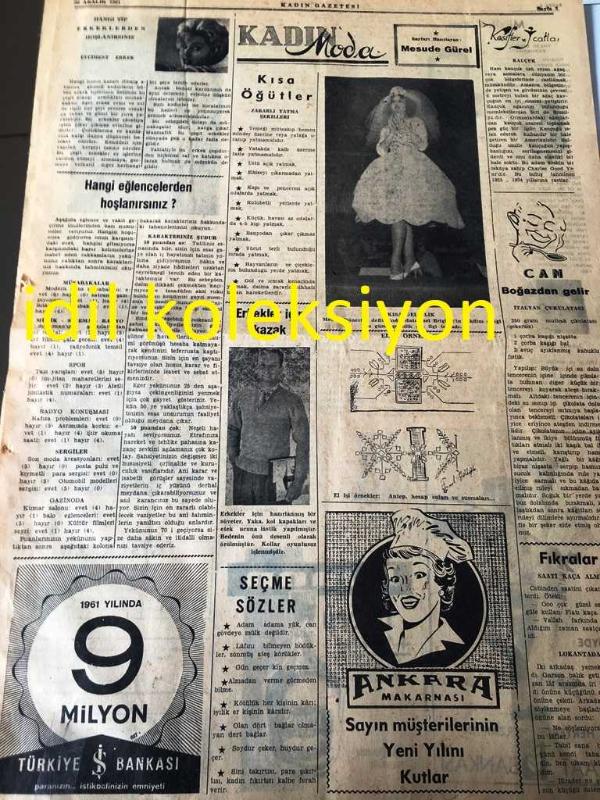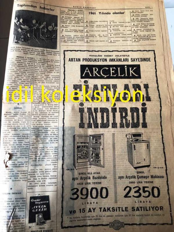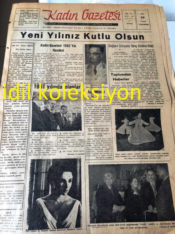 İSTANBUL KADIN GAZETESİ YEREL TAŞRA BASINI ---30 Aralık 1961 Yıl :15 Sayı :695--Bir Yıl Daha Geçti :İffet Halim Oruz -- Kadın Gazetesi 1962 Yılı Hamlesi --1961 yılında olanlar --Değişen Dünyada Genç Kadının Rolü --1961 yılının en başarılı sinema sanatçısı Elizabeth Taylor ---Migros 'un kuruluşta açtığı self servis mağazasında Umum Müdür ve yazarlarımı Hasene Ilgaz ve Tuna Görülmektedir --Tevfik Fikret 'i Anarken :Hasene Ilgaz--Müzik Köşesi --Hazırlayan :Jak Jabes :Lawrence Welk --Johnny Mathis --Toplumdan Haberler --Prenses Margaret 'in bebeği evine gidiyor -- Yıpranma, sararmalar, kupon kesiği ve yırtılmalar zamana bağlı olarak görülebilir.