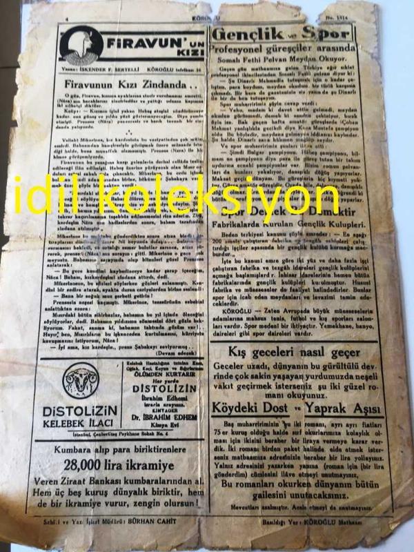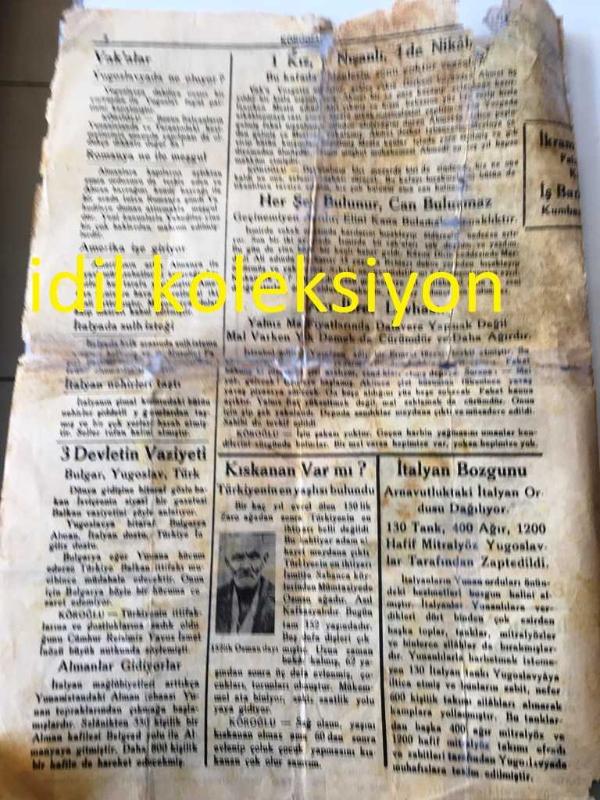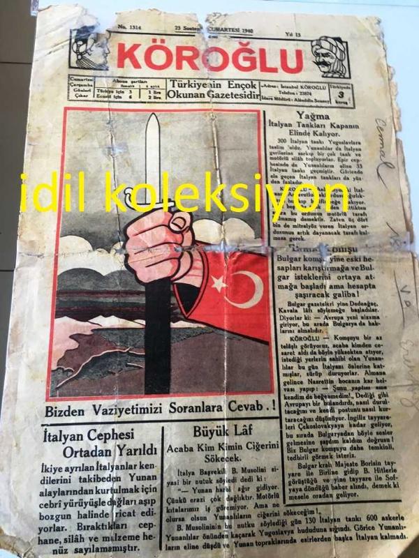 İSTANBUL KÖROĞLU GAZETESİ YEREL TAŞRA BASINI -- 1940 Sayı :1314 Yıl :13-- Yağma İtalyan Tankları Kapanın Elinde Kalıyor --İtalyan Cephesi Ortadan Yarıldı --Vakalar --3 Devletin Vaziyeti --Kıskanan Var Mı ?---İtalyan Bozgunu --Mehmetçik Ne Diyor ?--Bursalılar Zengin Olmak İsterlerse --Fransa Ayaklanıyor --40 Uçan Kale -- Yazan :İskender F. Sertelli :Firavunun Kızı Zindanda -- Yıpranma, sararmalar, kupon kesiği ve yırtılmalar zamana bağlı olarak görülebilir.