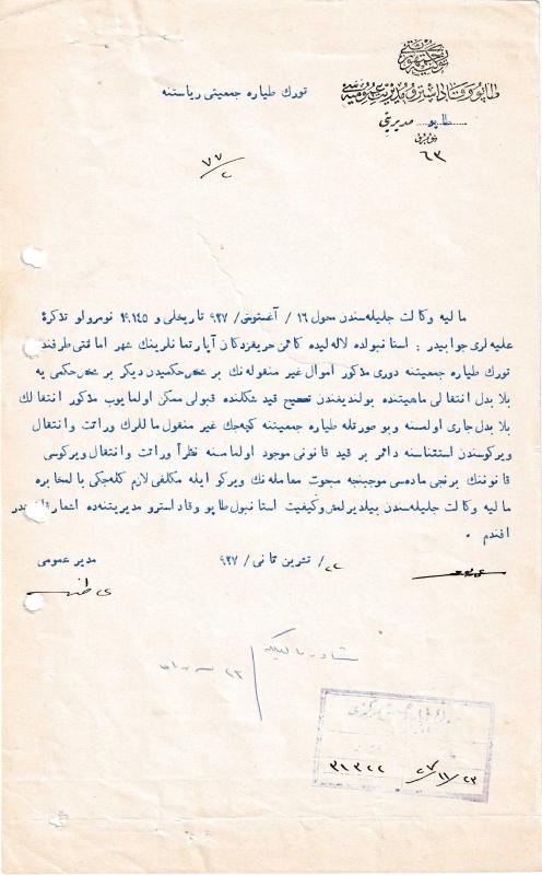 Özgün “Türkiye Cumhuriyeti Tapu ve Kadastro Müdüriyet-i Umûmîsi” antetli kağıda Osmanlıca daktilo edilmiş, tamamı Osmanlıca, 10 satır, 27 x 17 cm; sol kısımda iki çift delgeç deliği (biri metne hafif girmiş, okumaya engel değil), üst ve alt boşluklarda iğne izi, cemiyet damgası, haricen son derece temiz bir belge. Bu eşsiz tarihî Osmanlıca belgede 1927'de Maliye Vekâleti ile Türk Tayyare Cemiyeti arasında, Laleli'deki Harikzedegân (Tayyare) Apartmanları'nın belediyeden cemiyete bedelsiz devri ve bu devir işleminin vergi muafiyeti kapsamına girip girmediği tartışılmış, sonuçta mesele Veraset ve İntikal Vergisi Kanunu çerçevesinde ele alınmıştır. Metnin transkripsiyonu: “Türk Tayyâre Cemiyeti riyâsetine, Mâliye Vekâleti celîlesinden Ağustos [1]927 tarihli ve 19145 numerolu tezkîre-i alîyeleri cevâbıdır: İstanbul’da Lâleli’de kâin Harîkzedegân Apartmanları’nın Şehremâneti tarafından Türk Tayyâre Cemiyeti’ne devr-i mezkûr emvâl-i gayr-ı menkûlenin bir şehr-i hükmîden diğer bir şehr-i hükmîye bilâbedel intikâli mahiyyetinde bulunduğundan (?) kayd şeklinde kabûlü mümkün olmayub mezkûr intikâlin bilâbedel cârî olmasına ve bu sûretle Tayyâre Cemiyeti’ne geçecek gayr-ı menkûl malların Verâset ve İntikâl Vergisi’nden istisnâsına dâir bir kayd kanunu mevcûd olmasına nazâran Verâset ve İntikâl Vergisi Kanunu’nun yedinci maddesi mûcîbince mebhût muâmelenin vergi ile mükellefi lâzım geleceği (?) Mâliye Vekâleti Celîlesinden bildirilmiş ve keyfiyet İstanbul Tapu ve Kadastro Müdüriyeti’ne de eş’ar kılınmıştır efendim. 22 Teşrîn-i Sânî [1]927, Müdür-I Umûmî [imza].”Belge bir gün sonra tek bir ibâreyle belirtilmiş bir muâmele görmüş: “Müşâvir mâliki(?), fî 23…” Tayyare Apartmanları (Harikzedegân Apartmanları) İstanbul'un Laleli semtinde yer alan ve mimarlığını dönemin önde gelen isimlerinden Mimar Kemalettin Bey’in üstlendiği Harikzedegân Apartmanları, 1919'da başlanıp 1922'de tamamlanan dikkat çekici bir yapı topluluğudur. Bugün kullandığımız 20 TL’nin arka yüzünde portresi bulunan Kemalettin Bey’in en önemli projelerinden biri kabul edilen apartmanlar, Cumhuriyet'in ilk yıllarının toplu konut anlayışını yansıtan öncü örneklerden sayılır. Yapının inşa edilme amacı, 1918’de Cibali, Fatih ve Altımermer çevresinde çıkan ve geniş bir alanı yok eden büyük İstanbul yangınıdır. Yangında evlerini kaybeden ailelerin barınma ihtiyacını karşılamak üzere tasarlanan bu apartmanlara, "yangınzede" anlamına gelen Harikzedegân adı verilmiştir. Dört blok halinde yükselen yapı topluluğu, tamamlandığında 124 daireden oluşuyordu ve uzun yıllar boyunca konut işleviyle kullanıldı. 1922'den 1985'e kadar apartman olarak hizmet veren binalar, bu tarihten sonra Türk Hava Kurumu'na devredildi ve kira geliri elde edilmeye başlandı. İşte buradan hareketle, yapılar zamanla Tayyare Apartmanları adıyla anılır oldu. 1985'te Net Turizm firmasına devredilen kompleks, önce Merit Antik Hotel, ardından başka işletmelere bağlı olarak farklı otel markalarıyla işletildi. Günümüzde ise restore edilerek modernleştirilen yapı, Laleli'de beş yıldızlı bir otel olarak kullanılmaya devam etmektedir. Rodos doğumlu Mustafa Atıf Bayındır (1883-1977), Mekteb-i Mülkiye mezunu bir Osmanlı siyasetçisidir. Bahrisefid Vilayeti Maiyet Memurluğu, Fav, Cumaibâlâ ve Gebze Kaymakamlıkları, Dahiliye Vekaleti Mahalli İşler Umum Müdürlüğü, Ankara, Kastamonu ve Halep Valilikleri, Tapu ve Kadastro Umum Müdürlüğü (1927-1931), Ziraat Vekaleti Müsteşarlığı, Osmanlı Meclis-i Mebûsan III. Dönem (istifa) Burdur Mebusluğu, TBMM V., VI. ve VII. Dönem İstanbul Milletvekilliği ile VI. ve VII. Dönem Maliye Encümeni Reisliği yapmıştır. Türk İnkılâbı ve Tasarruf” adlı bir çalışması ve “Muhayyel Ada” adlı bir romanı da Bayındır’ın çok yönlü entellektüel kişiliğini gösterir. -- İstanbul binaları Şehir tarihi