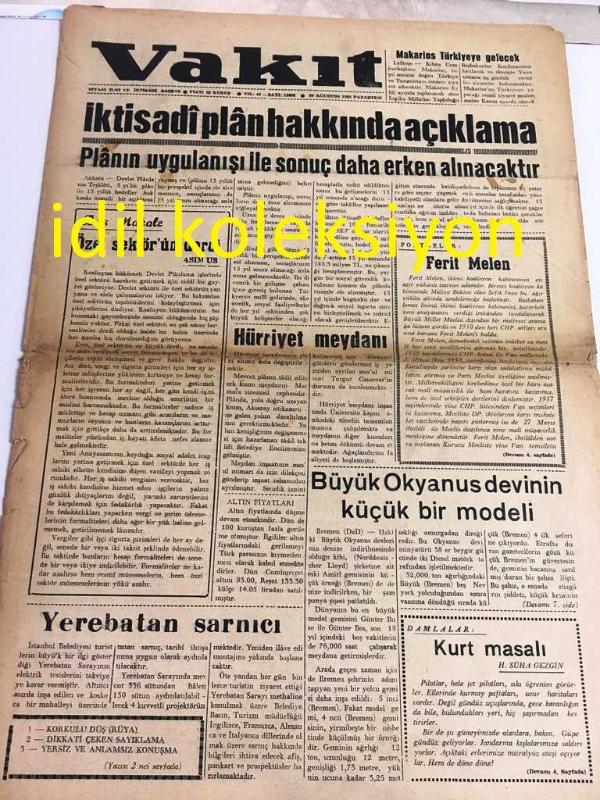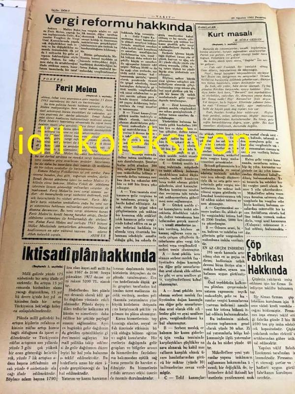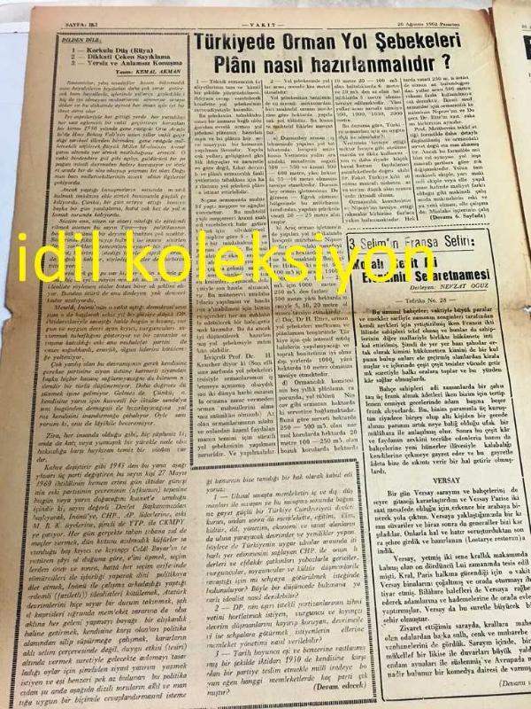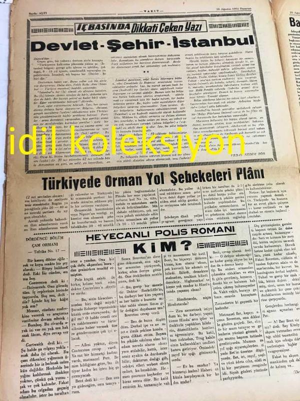 İSTANBUL VAKİT GAZETESİ YEREL TAŞRA BASINI --20 Ağustos 1962 Yıl :43 Sayı :13098--Makarios Türkiye 'ye Gelecek --İktisadi plan hakkında açıklama --Özel sektör 'ün derdi :Asım Us--Büyük Okyanus Devinin Küçük Bir Modeli --Kurt Masalı :H. Süha Gezgin --3. Selim 'in Fransa Seferi :Moralı Seyit Ali Efendinin Sefaretnamesi :Derleyen Nevzat Oğuz --Ekrem Alican 'ın Bir Konuşması --Vergi Reformu hakkımda ---Ferit Melen --Mutlu Günlerimiz ---Dünya Boks Şampiyonu Ross 'un Hatıraları --Devlet -Şehir İstanbul --Türkiye Orman Yol Şebekeleri Planı --Batı Trakya Türklerinin Şikayeti ---Alaska da Dev Ayılar Avı --Türkiye 'nin av hayvanları tesbit işini konuşa dururken :Turhan Tamerler --Alaska da Dev Ayılar Avı :Yazan :Walter Fınton --- Yıpranma, sararmalar, kupon kesiği ve yırtılmalar zamana bağlı olarak görülebilir.