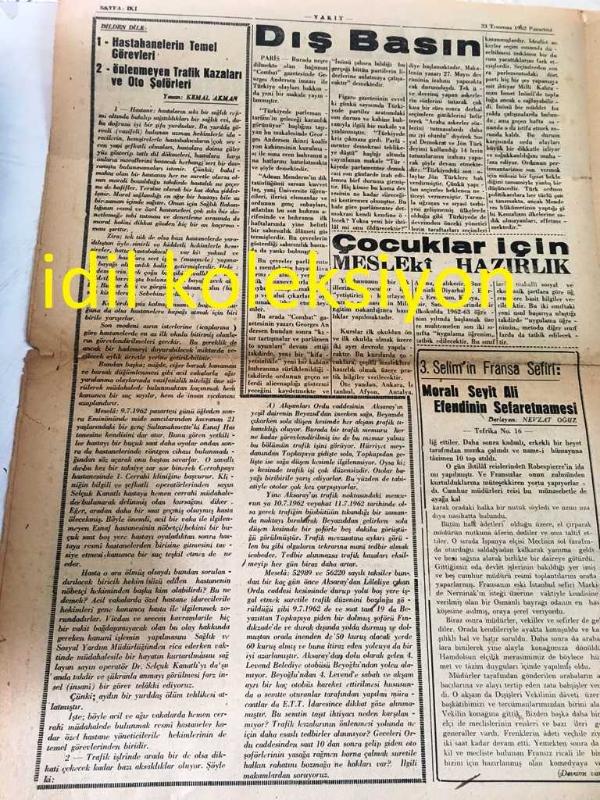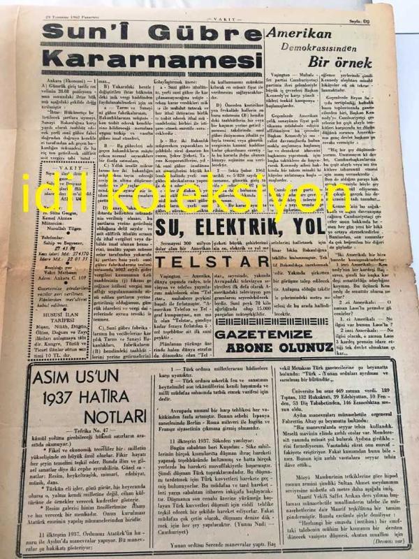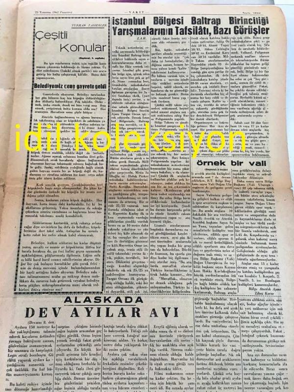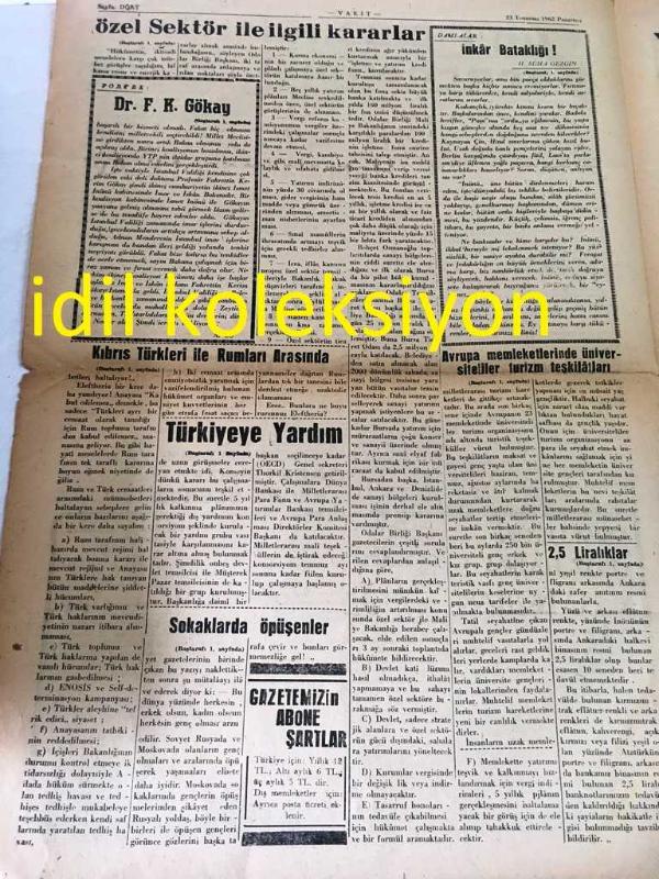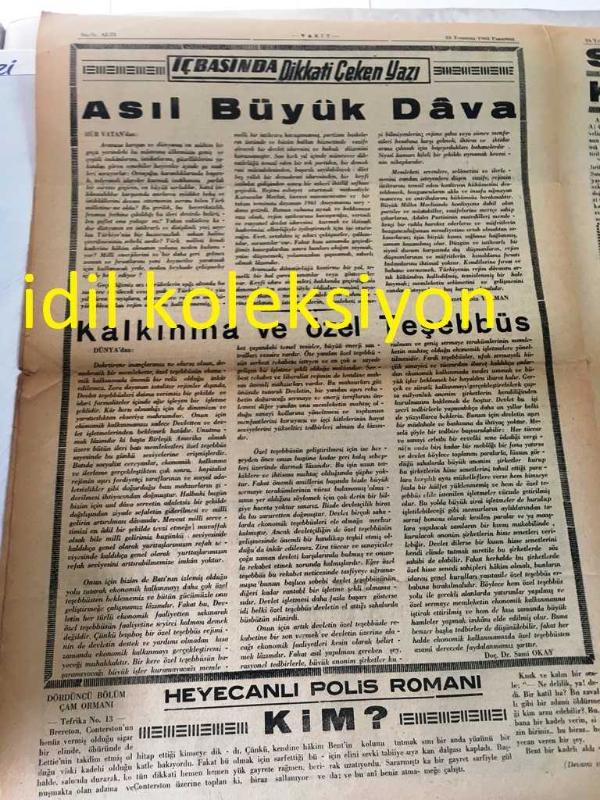 İSTANBUL VAKİT GAZETESİ YEREL TAŞRA BASINI ----23 Temmuz 1962 Yıl :43 Sayı :13094--Kar Getiren iktisadi Devlet Teşekkürlerinden Bir Kısmını Özel Sektör 'e Nakletmek --Bir Ziyaretin Manası :Asım Us--Kıbrıs Türkleri ile Rumları Arasındaki Münasebetleri Baltalayan Esas Sebepler ---Dr. F.K Gökay :H.Süha Gezgin --Asıl Büyük Dava --Kalkınma ve özel teşebbüs --Sun'i Gübre Kararnamesi --Amerikan Demokrasisinden Bir Örnek --Asım Us 'un 1937 Hatıra Notları --Dünya Boks Şampiyonu Ross 'un Hatıraları --Doiş Memleketlerden Türkiye 'ye Gelerek Avlanmak İsteyenlerin Sayısı Günden Güne Artıyor ---Aydın Valisi Doğan Uluergüven Nazilli de Yıpranma, sararmalar, kupon kesiği ve yırtılmalar zamana bağlı olarak görülebilir.