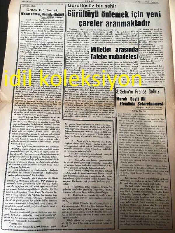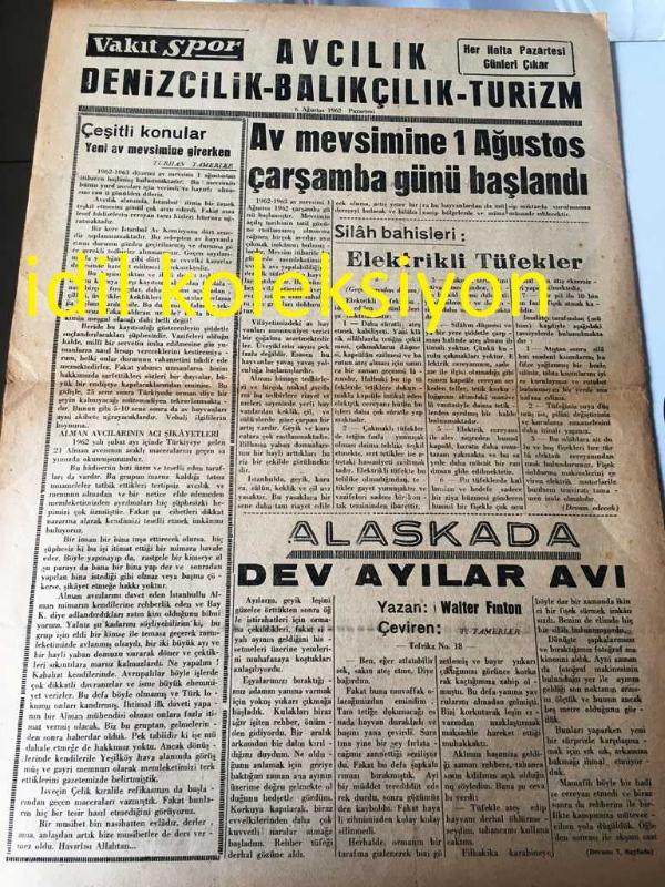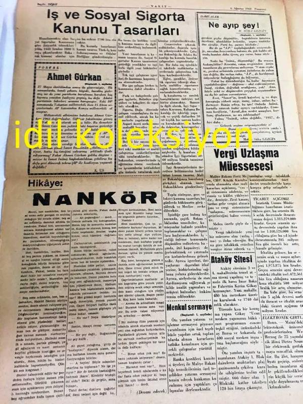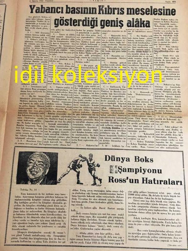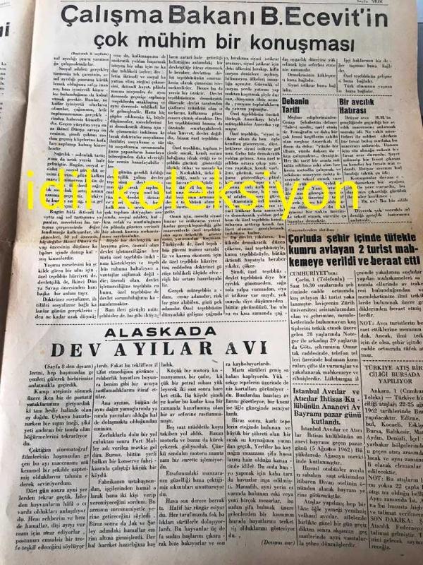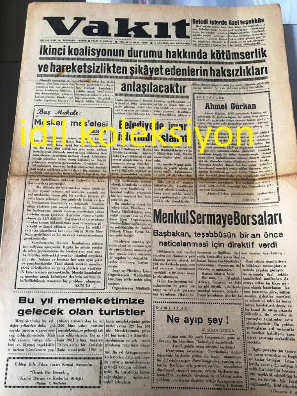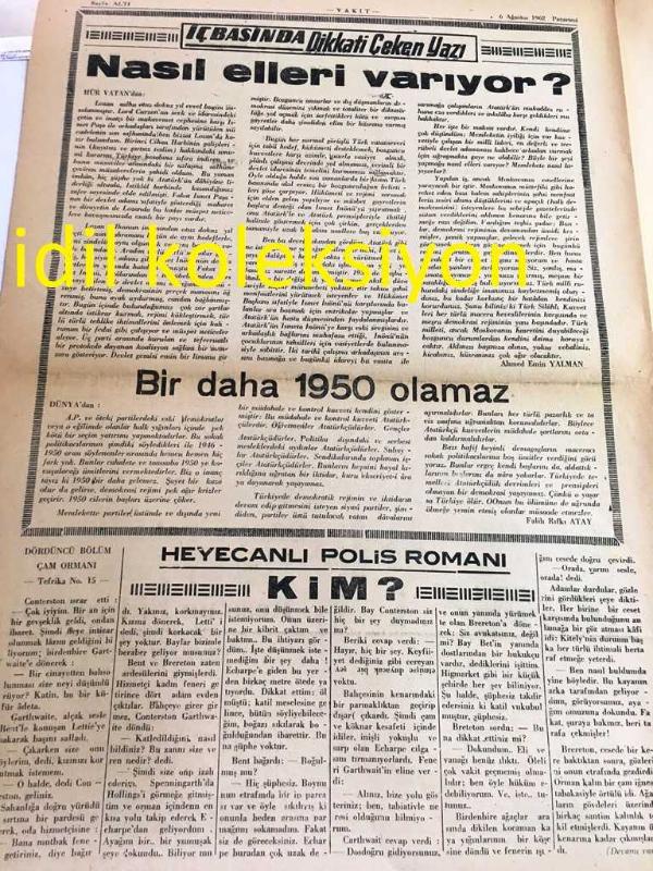 İSTANBUL VAKİT GAZETESİ YEREL TAŞRA BASINI ----6 Ağustos 1962 Yıl :48 Sayı :13096--İkinci koalisyon durumu hakkında kötümserlik ve hareketsizlikten şikayet edenlerin haksızlıkları ---Mesken Meselesi :Asım Us-- Bu yıl memleketimize gelecek olan turistler --Belediye imar işlerinde ıslahat --Ahmet Gürkan -Ne Ayıp Şey :H.Süha Gezgin --Nasıl elleri varıyor ? Ahmet Emin Yalman --Bir daha 1950 olamaz--Çalışma Bakanı Bülent Ecevit 'in Çok Mühim Bir Konuşması--Asım Us 'un 1937 hatıra Notları ---İş Ve Sosyal Kanunu Tasarıları --Yabancı basının Kıbrıs meselesine gösterdiği geniş alaka --Dünya Boks Şampiyonu Ross 'un Hatıraları -çeşitli Konular Yeni Av Mevsimine Girerken : Turhan Tamerler --Av mevsimine 1 Ağustos çarşamba günü başlandı --Dev ayılar avı yazan :Walter Fınton - Yıpranma, sararmalar, kupon kesiği ve yırtılmalar zamana bağlı olarak görülebilir.
