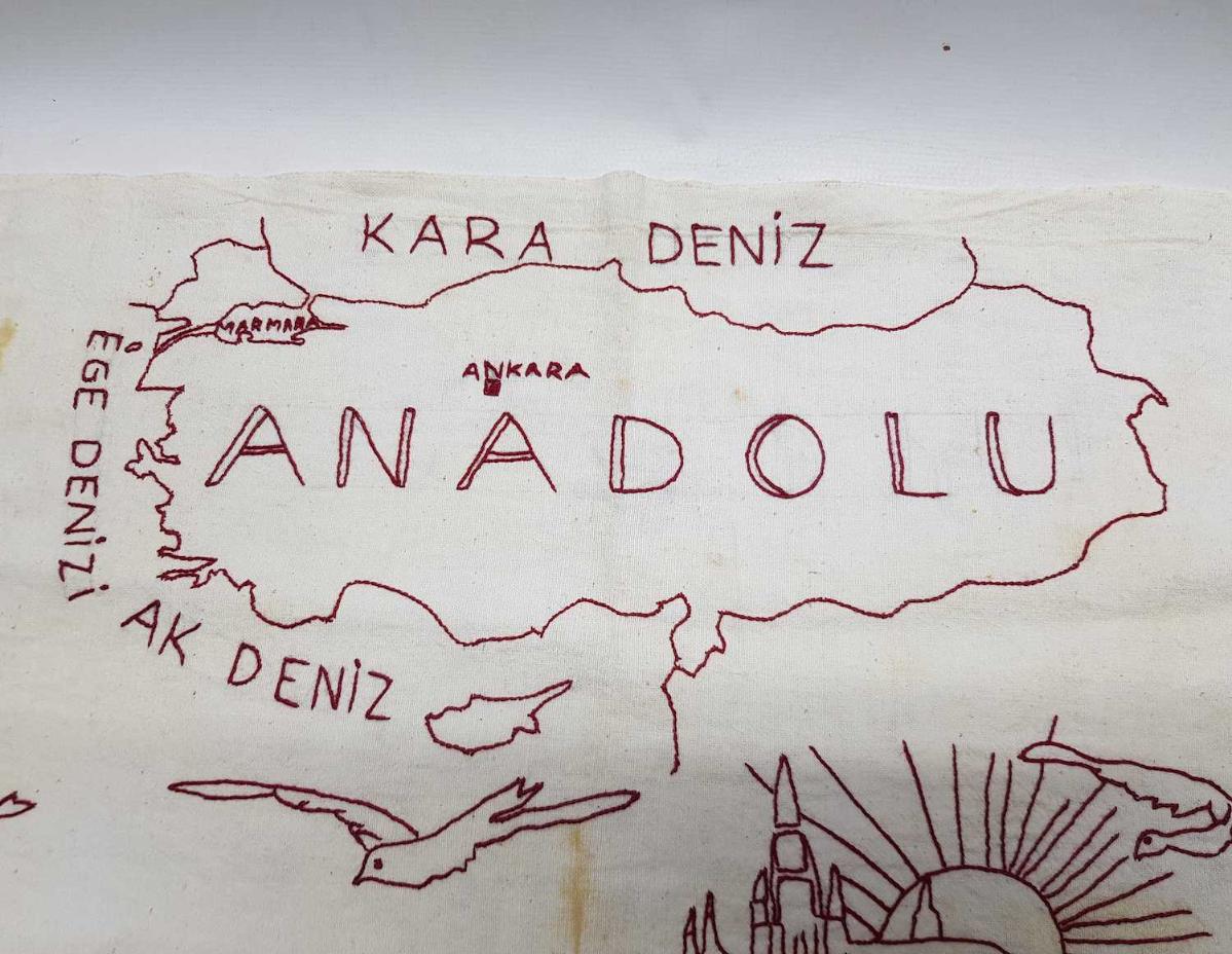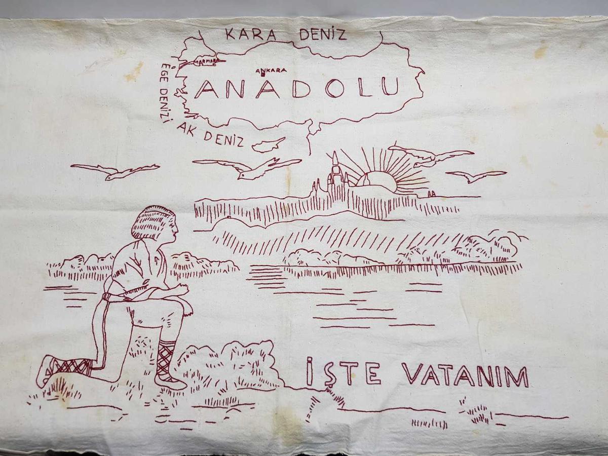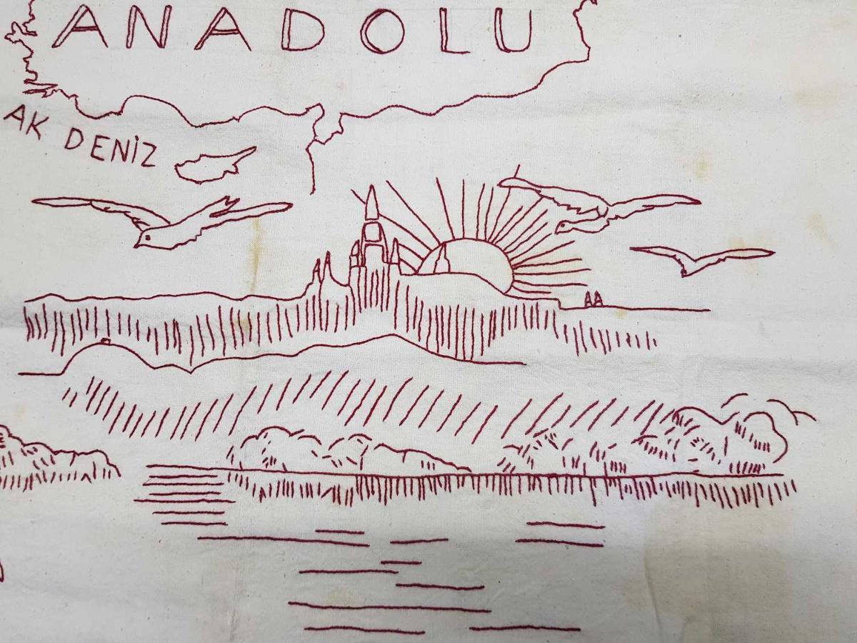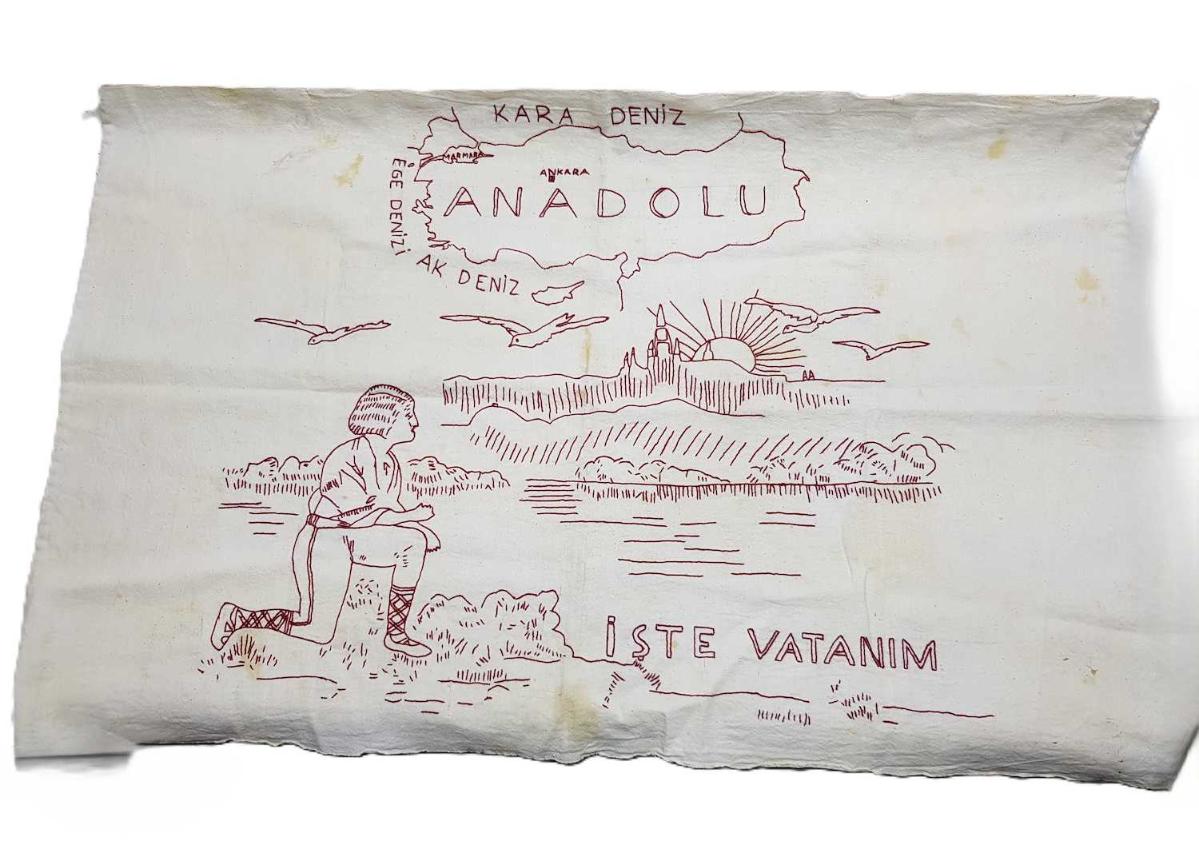 1940-1950'LERDEN VATAN SEVGİSİ KONULU EL İŞLEME DUVAR PANOSU. PAMUKLU KUMAŞ ÜZERİ İPLİKLERLE EL İŞLEME YAPILMIŞ NADİR BİR PANO. EBAT: 98 X 61 CM