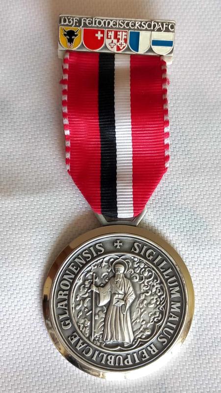 RESİMDEKİ ÜRÜN GÖNDERİLECEKTİR. Madalyanın etrafındaki "SIGILLUM MAIUS REIPUBLICAE GLARONENSIS" ifadesi, Latince'de "Glarus Cumhuriyeti'nin Büyük Mührü" anlamına gelir. Figür: Ortadaki figür, Glarus kantonunun koruyucu azizi olan Aziz Fridolin'dir. Bir elinde asası, diğerinde ise İncil tutarken tasvir edilmiştir. Üst Kısım: Üstteki metal çubukta yer alan "FELDMEISTERSCHAFT" kelimesi Almanca "Saha Şampiyonası" anlamına gelir ve genellikle atıcılık veya spor müsabakalarıyla ilgili ödüllerde kullanılır. Yanındaki armalar İsviçre'deki çeşitli kantonları ve federal yapıyı simgelemektedir. Bu tip madalyalar genellikle İsviçre'de düzenlenen geleneksel atıcılık festivalleri (Schützenfest) veya yerel spor şampiyonaları kapsamında katılımcılara veya kazananlara verilmektedir.